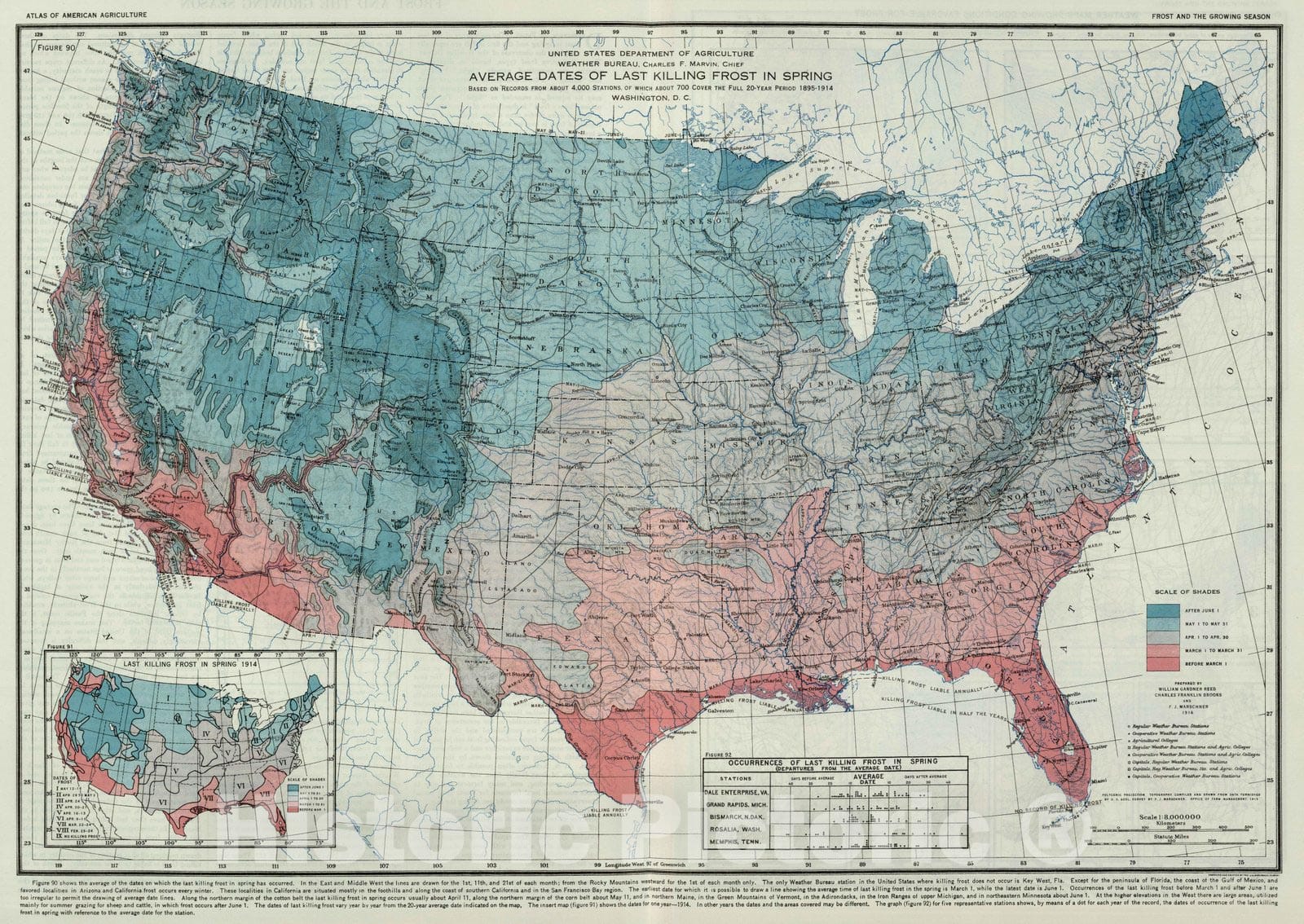 Historic Map : National Atlas - 1916 Average Dates of Last Killing Frost in Spring. Atlas of American Agriculture. - Vintage Wall Art