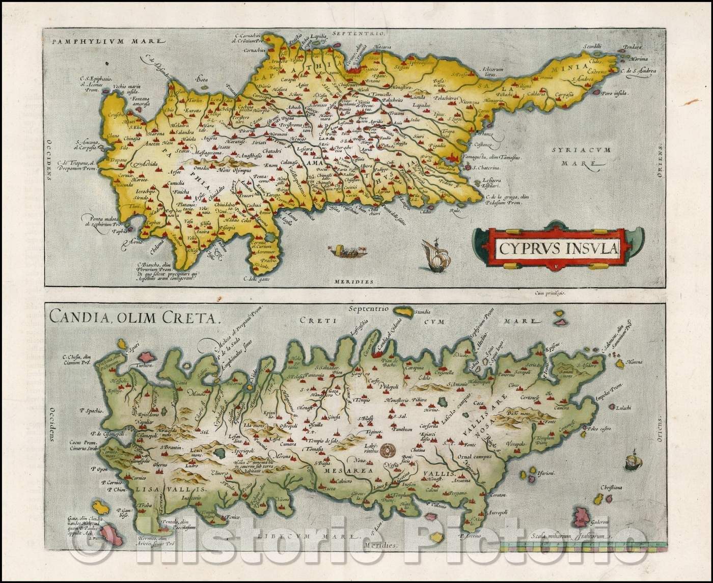 • .Historic Map - Cyprus Insula with Candia, Olim Creta, 1575, Abraham Ortelius - Vintage Wall Art
