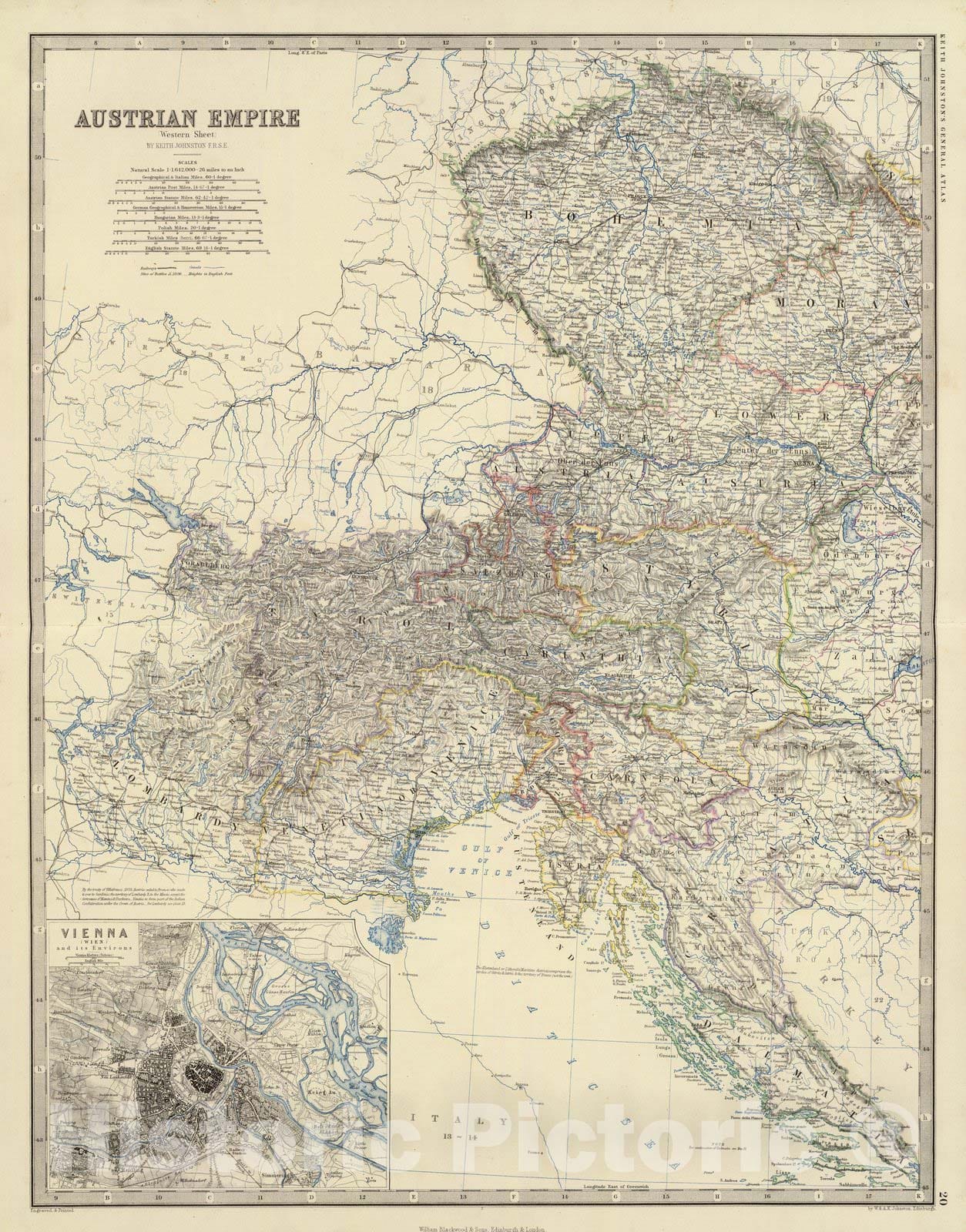 Austrian Empire, western sheet, by Keith Johnston, F.R.S.E. (with) Vienna, Wien and its environs. Engraved & printed by W. & A.K. Johnston, Edinburgh. William Blackwood & Sons, Edinburgh & London, (1861) | The royal atlas of modern geography, exhibiting, in a series of entirely original and authentic maps, the present condition of geographical discovery and research in the several countries, empires, and states of the world by Alexander Keith Johnston ... With a special index to each map. William Blackwood and Sons, Edinburgh and London. MDCCCLXI. | First edition. This atlas was one of the best world atlases published in England in the second half of the 19th century. The North America map shows Colorado as a Territory - very up to date on U.S. political changes (most U.S. atlases do not show Colorado until 1862) for an English Atlas. Also shows Nevada, and a horizontal Arizona. However, the western U.S. map shows none of this -- its layout is pre-1860. Maps have a mixture of hand colored outline and printed blue color for water. Covers are half leather brown cloth covered boards with "Keith Johnston's royal atlas of modern geography" stamped in gilt on the cover, and "The Royal Atlas. Keith Johnston. W. Blackwood & Sons" on the spine.