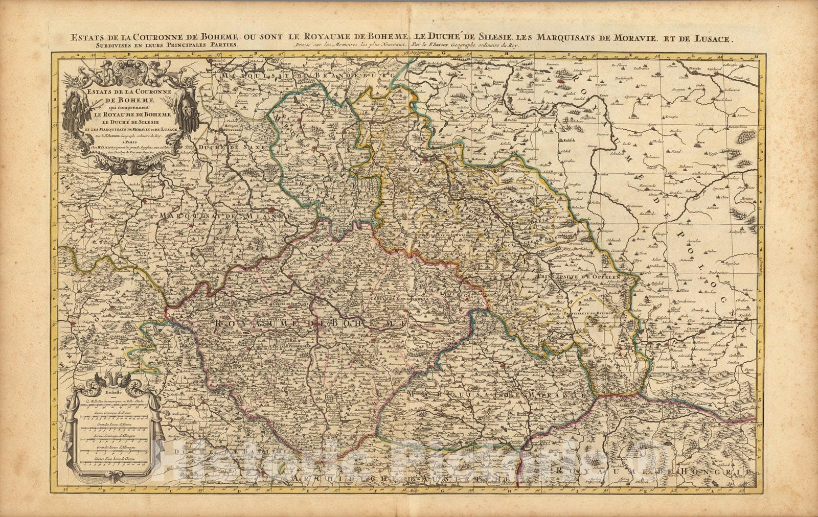 Estats de la Couronne de Boheme. | Atlas Nouveau Contenant Toutes Les Parties du Monde, ou Sont exactement Remarques Les Empires, Monarchies, Royaumes, Estats, Republiques & Peuples qui fy trouuent a present. Par le Sr. Sanson, Geographe ordinaire du Roy. Presente a Monseigeur le Dauphin ... Hubert Jaillot Geographe du Roy. A Paris, Chez Hubert Jaillot .... | This issue of the Mortier/Jaillot Atlas Nouveau has 169 maps (1 more than the normal count of 168) plus diagrams, text pages, decorated titles and index pages. It is noted for the large number of multi-sheet "Theatre de la Guerre" (Theater of War) maps covering the battles raging in Europe and the Americas during the Spanish War of Succession (1701-1713) and the Northern War (1700-1721). The Atlas Nouveaux was first published by Jaillot in Paris in 1681(46 maps) with later issues by him in 1684 (72 maps) and 1689 (80 maps). In 1692 Pierre Mortier published his first edition of the Jaillot atlas with 99 maps, another edition followed in 1696 with 111 maps. In 1707/1708 Mortier issued our edition with 168 maps. Later editions by Mortier expanded the atlas even further - 1708, 200 maps; ca 1721, 300 maps; ca 1735, 400 maps. The atlas maps are large folio size with most maps made of two sheets and many maps combining 4 or 6 sheets (those also issued as wall maps separately). The atlas is most impressive for its large size and number of maps as well as being up to date for its time. This copy colored in outline with relief shown pictorially.