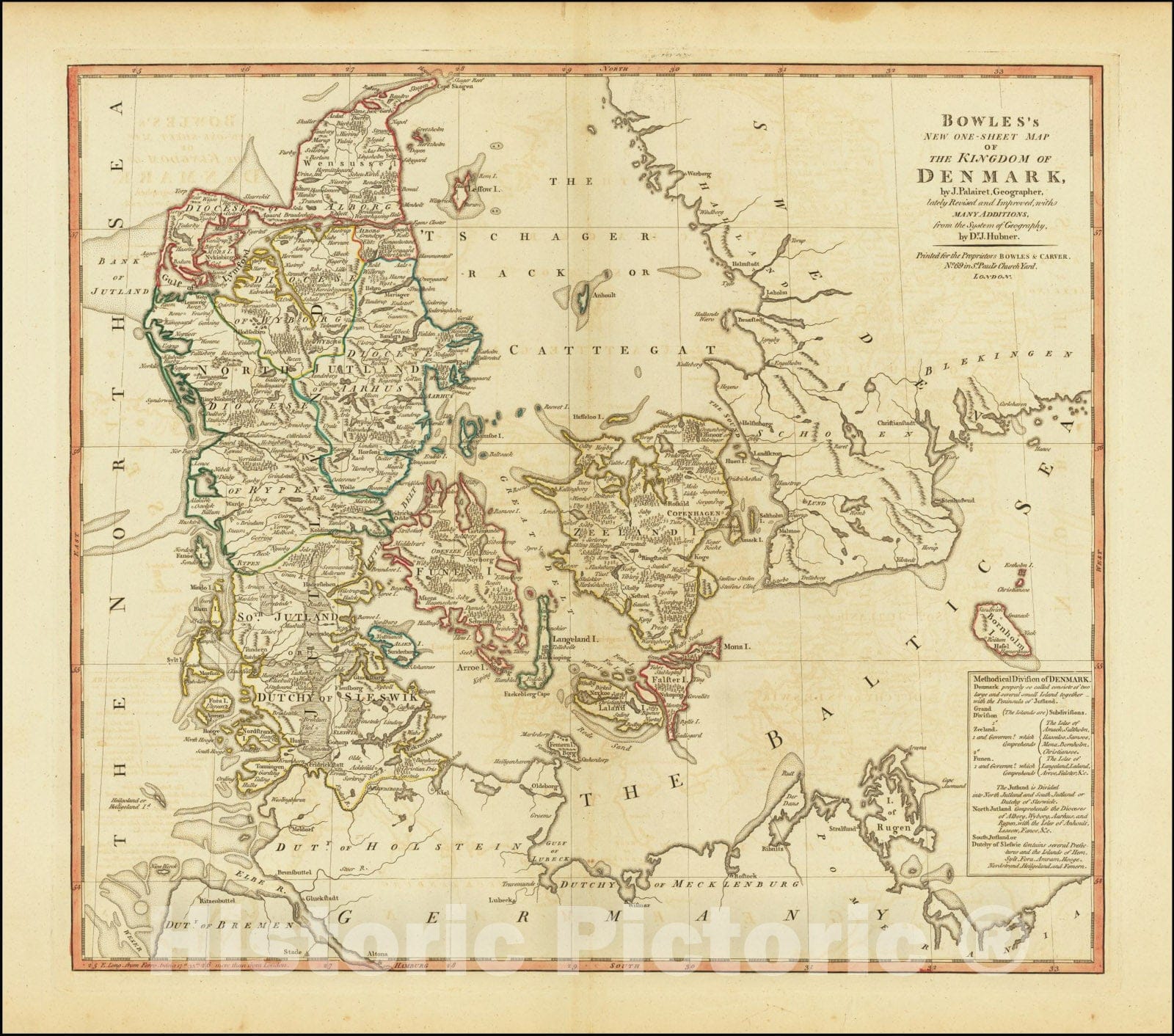 Historic Map : Bowles's New One-Sheet Kingdom of Denmark, by J. Palaairet, Geographer, laterly Revised and Improved with Many Additions from the System of Geography by Dr. J. Hubner., 1795, Vintage Wall Art