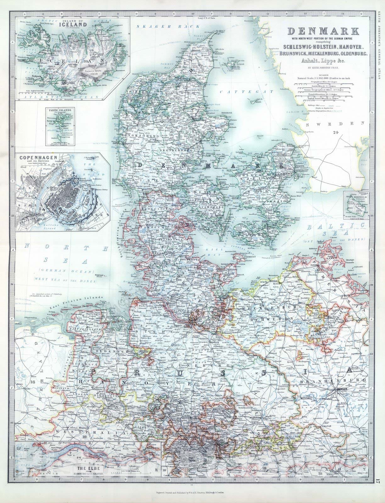 Historic Map : 1893 Denmark with Northwest portion of the German Empire - Vintage Wall Art