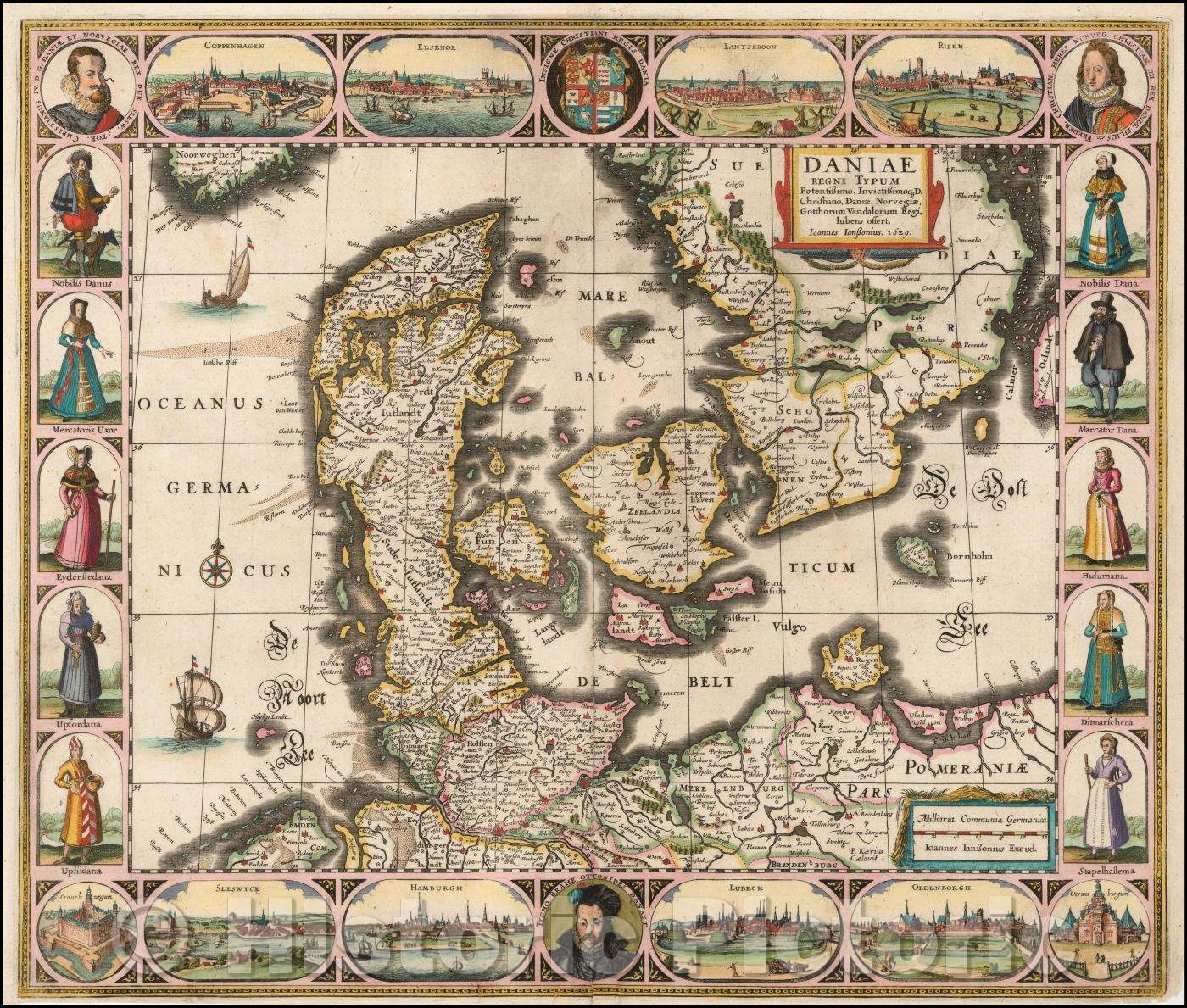Daniae Regni Typum Potentissimo Invictissimoq D. Christiano, Daniae / Jansson carte-a-figures Map of Denmark, 1629, Jan Jansson