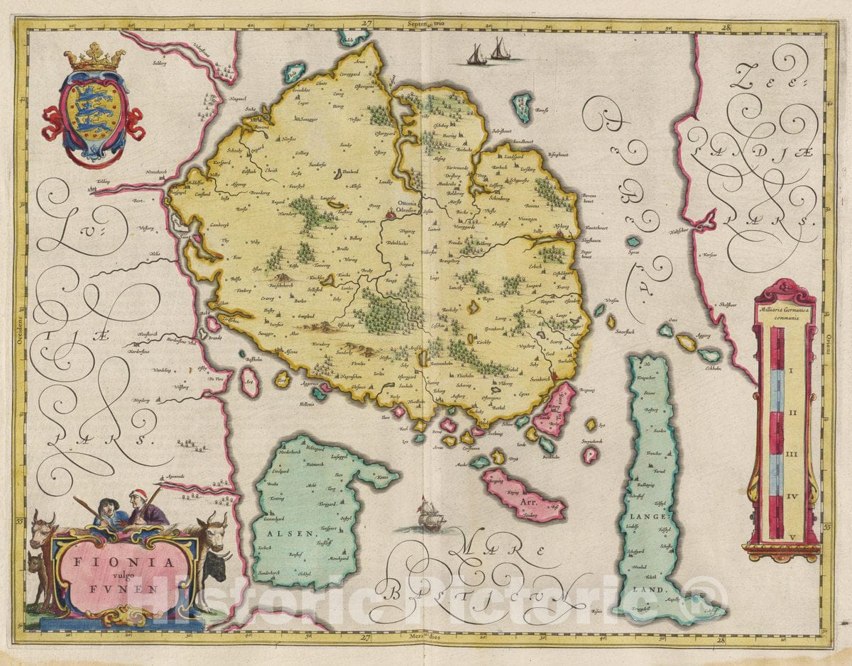 Historic Map : Denmark, Funen Island (Denmark) Atlas Maior Sive Cosmographia Blaviana, Fionia vulgo Fvnen, 1665 Atlas , Vintage Wall Art