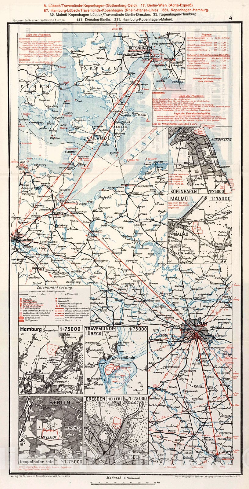 Historic Map : Denmark and Northern Germany Airline Route Map. (insets) (Airport Locations)., 1928, Vintage Wall Decor
