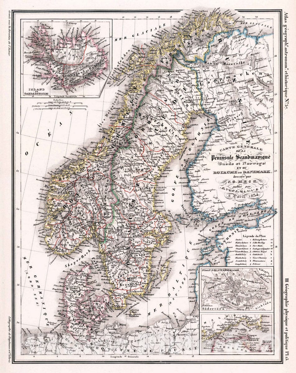 Historic Map : Denmark, Scandinavia 1834 37. Carte Generale de la Peninsule Scandinavique (Suede et Norwege) et Danemark. , Vintage Wall Art