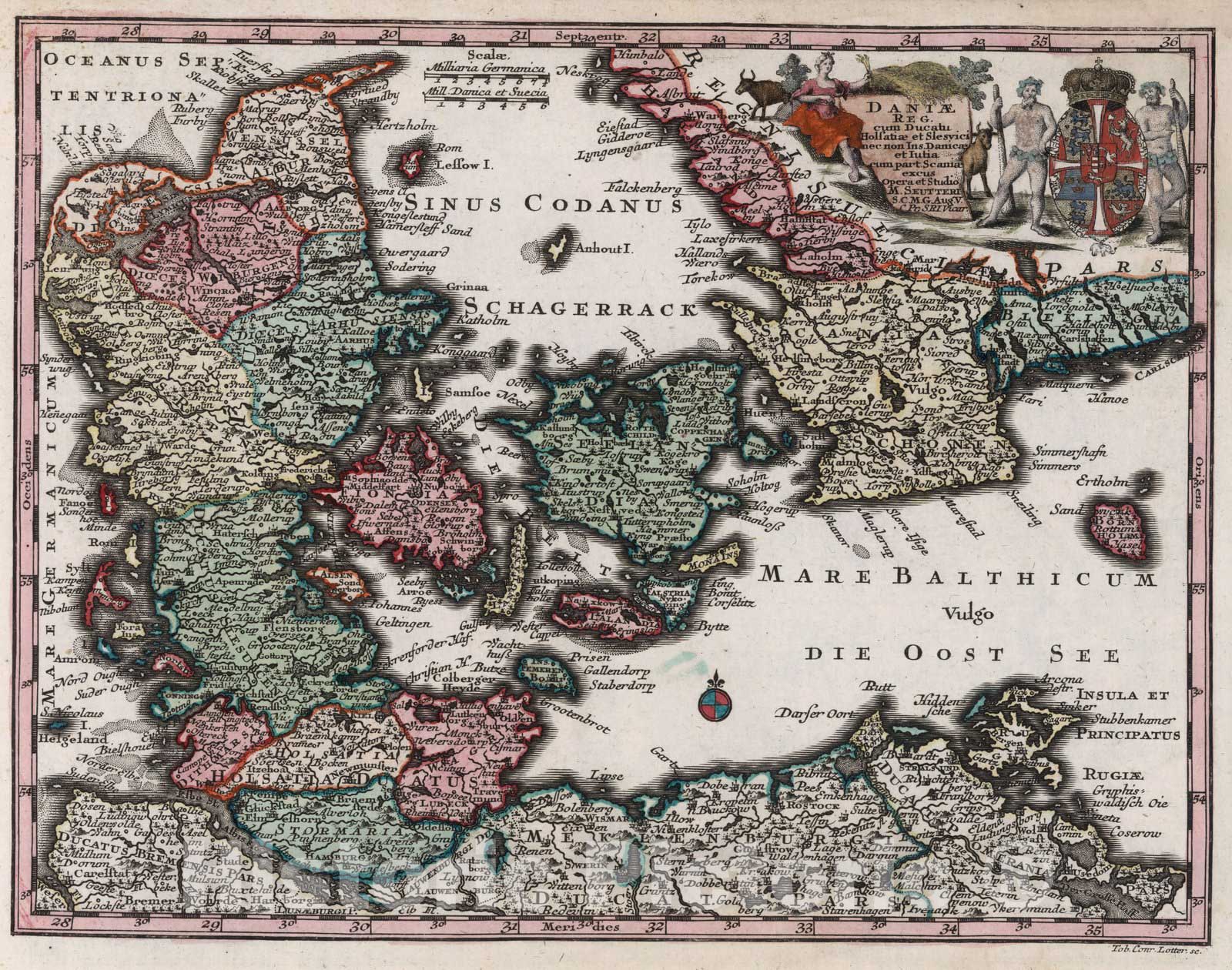 • Historic Map : Denmark,Daniae Reg. cum Ducatu Holsatiae et Slesvici 1744 , Vintage Wall Art