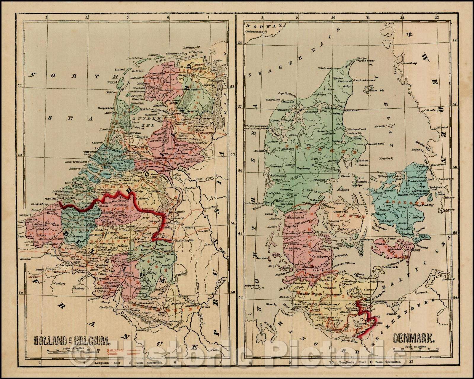Historic Map - Holland and Belgium (with) Denmark, 1856, Sidney Morse - Vintage Wall Art