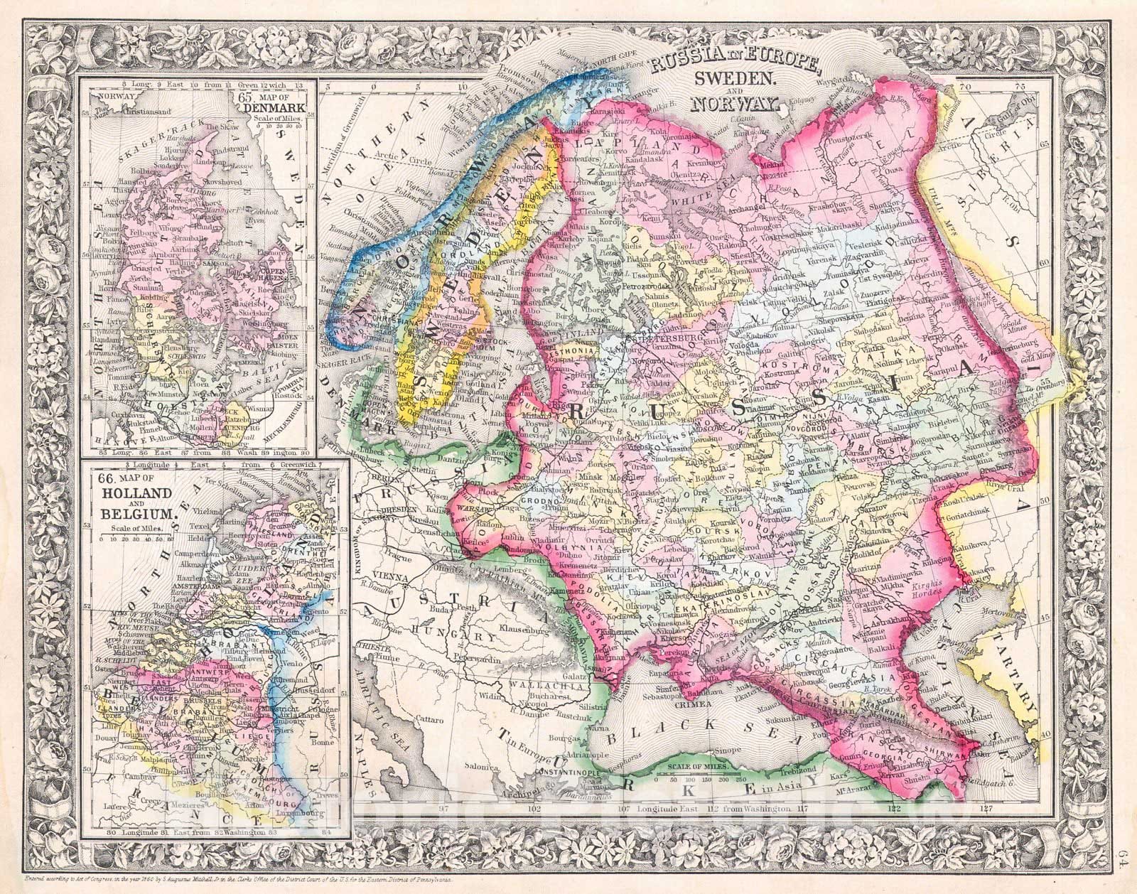 A beautiful example of S. A. Mitchell Jr.'s 1864 map of Russia, Norway, Sweden, Holland Belgium and Denmark. Maps of Denmark, Holland and Belgium relegated in insets on the left hand side of the map. Denotes both political and geographical details. Ext