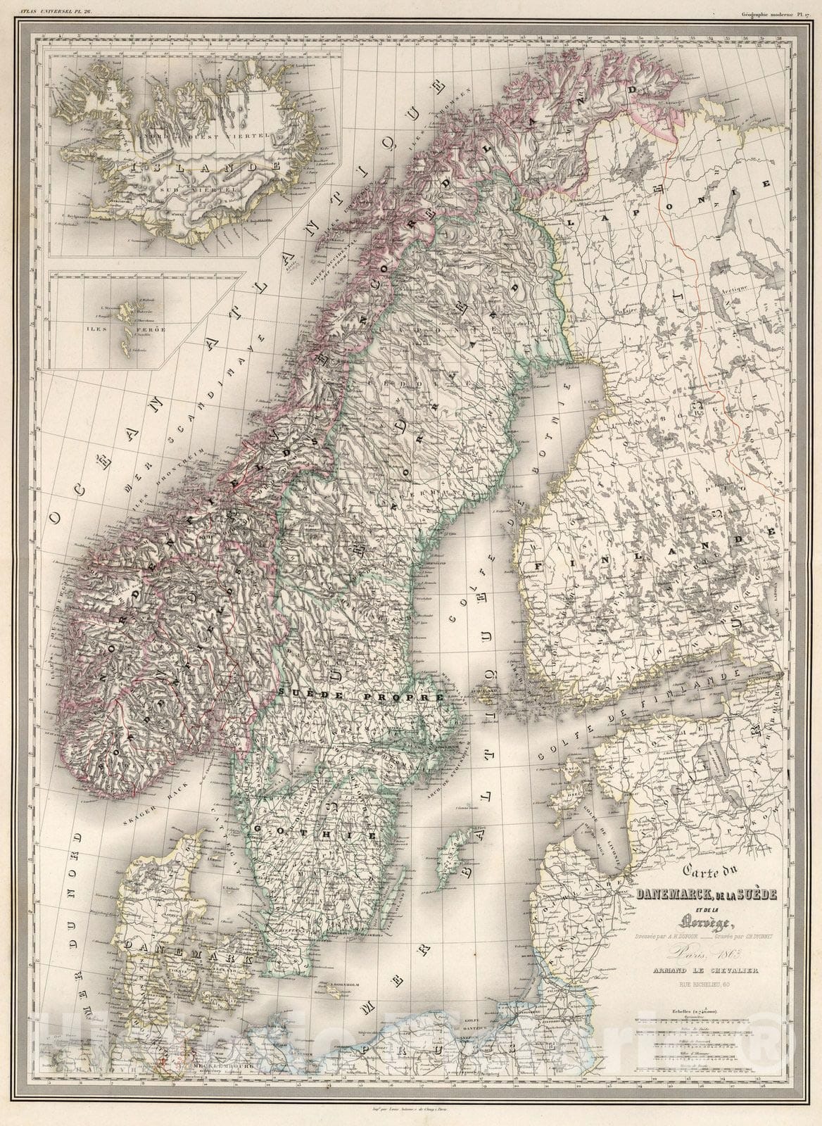 Carte du Danemarck de la Suede et de la Norvege : Dresse par A.H. Dufour. Gravee par Ch. Dyonnet. Paris 1863, Armand Le Chevalier, Rue Richelieu, 60. Impe. par Louis Antonie, r. de Cluny 1, Paris. (insets) Islande. (with) Iles Feroe. (to accompany) Atlas Universel, Physique, Historique Et Politique De Geographie Ancienne Et Moderne. Pl. 26. (on upper margin) Geographie moderne. Pl. 17. | Atlas Universel, Physique, Historique Et Politique De Geographie Ancienne Et Moderne. Compose Et Dresse Par H. Dufour. Grave Sur Acier Par Ch. Dyonnet ... Paris, Armand Le Chevalier, Editeur, Rue Richelieu, 60. (green paste down label) L'introduction de cet ouvrage dans les etablissements d'Instruction publique est autorisee par decision de s. Exc. M. Le Ministre De L'Instruction Publique, en date du 8 decembre 1863. | The maps are dated 1862 to 1865. The U.S. map shows the proposed state of Colona. Maps are hand painted in outline color. Covers are half leather dark brown marbled paper covered boards with a black leather label stamped with "Atlas Dufour" in gold. The spine is embossed with "Dufour Et Dyonnet. Atlas Universel. Geographie Ancienne Et Moderne. 40 Cartes. Le Chevalier." in gold.
