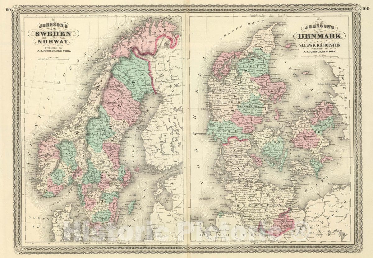 Historical Map : Johnson's Sweden and Norway. Published by A. J. Johnson, New York. Johnson's Denmark with Sleswick & Holstein. Published by A. J. Johnson, New York. 9, 1874