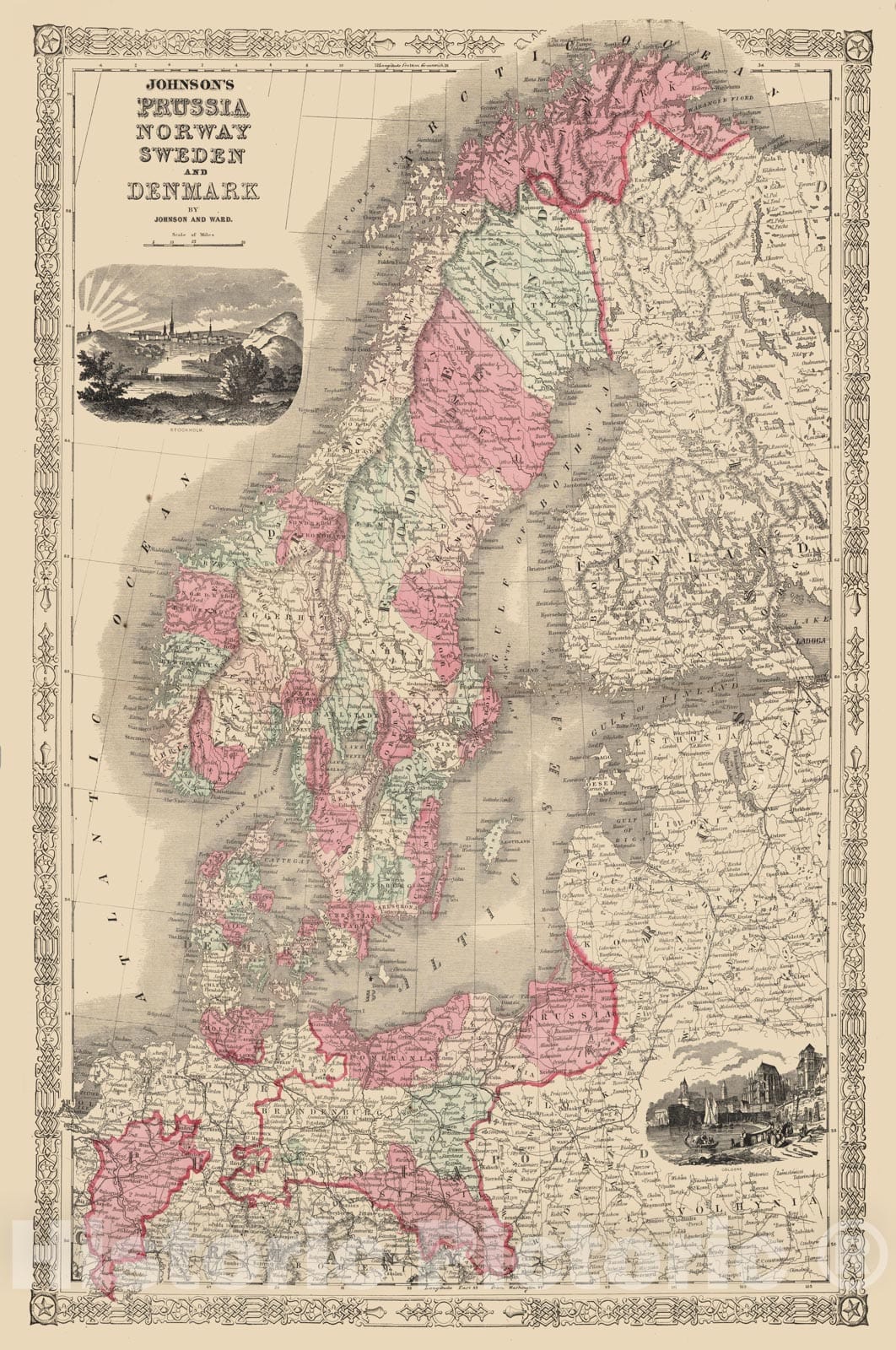 Historic Map : Denmark & Sweden & Norway & Prussia 1865 , Johnson's Family Atlas , Vintage Wall Art