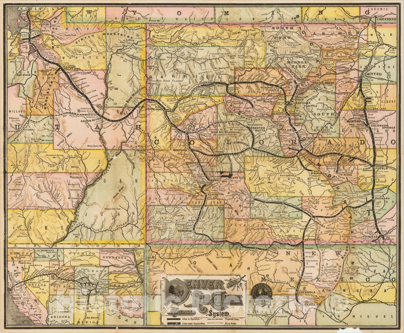 • .Historic Map : Denver and Rio Grande Railroad System., c1883, American Bank Note Company, Vintage Wall Art