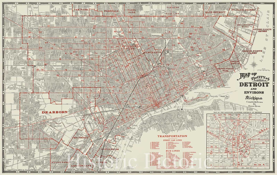 Historic Map : Map of the city of Detroit and Environs, Michigan, 1939 , Vintage Wall Art