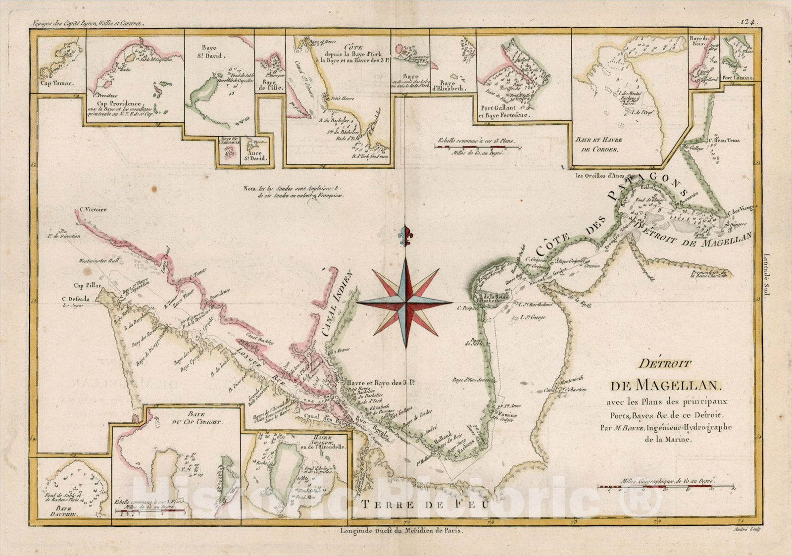 Historic Map : Detroit De Magellan avec les Plans des principaux Ports, Bayes, &c. de ce Detroit , 1787, Rigobert Bonne, Vintage Wall Art