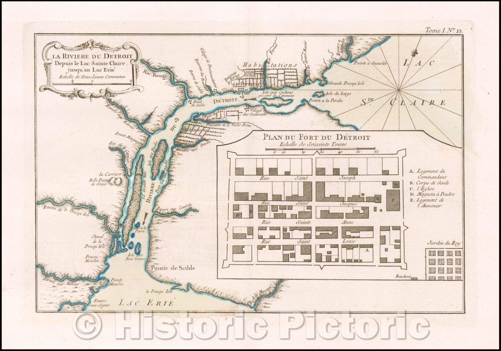 Historic Map - Detroit La Riviere Du Detroit Depuis le Lac Sainte Claire jusqu'au Lac Erie/Lake Erie, 1764, Jacques Nicolas Bellin v2