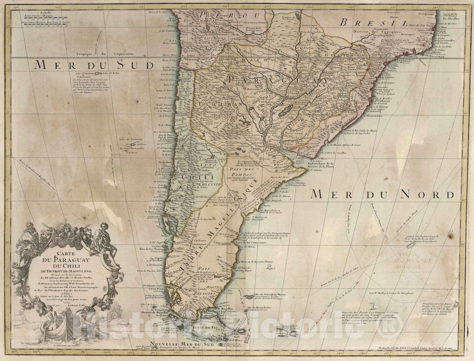 Historic Map : Paraguay, , South America 1703 Carte du Paraguay, du Chili, du Detroit de Magellan &c. , Vintage Wall Art