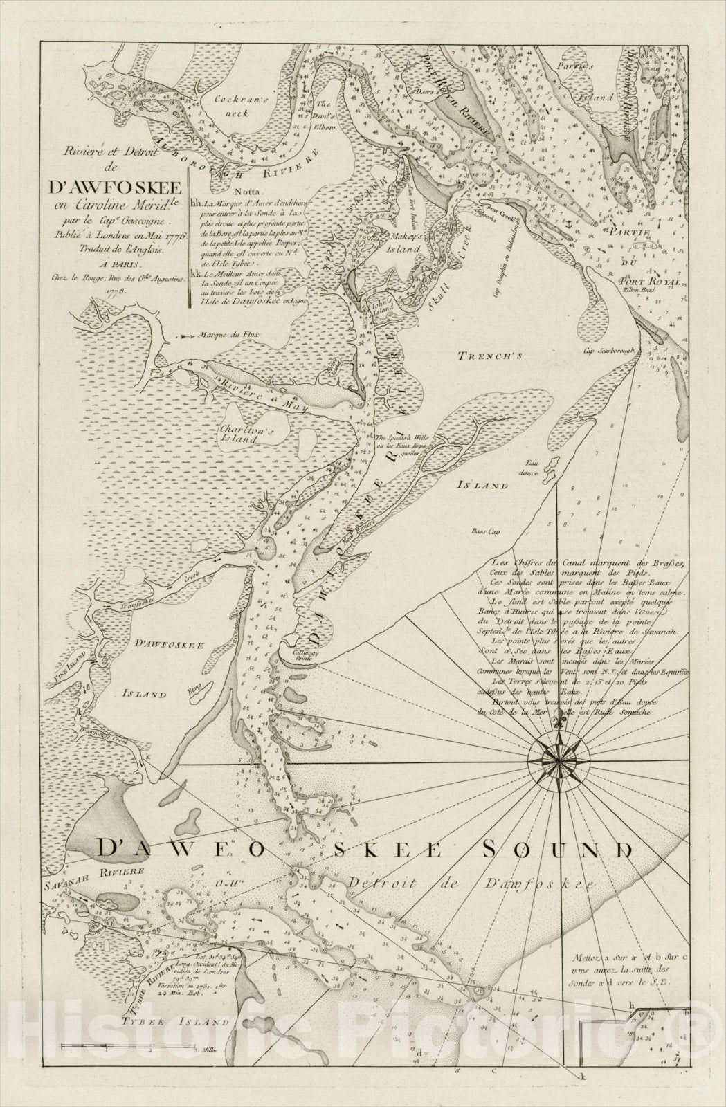 Historic Map : Riviere et Detroit de D'Awfoskee en Caroline Meridle. Par le Cape. Gascoigne, 1776, 1776, , Vintage Wall Art