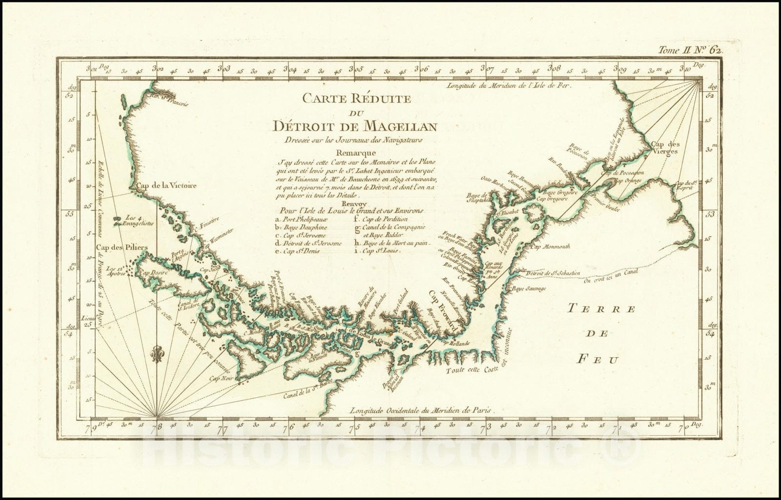 • .Historic Map : Straits of Magellan,Carte Reduite Du Detroit De MagellanDressee sur les Journaux des Navigateurs; Par le Sr. Bellin, 1753, 1764, Vintage Wall Art