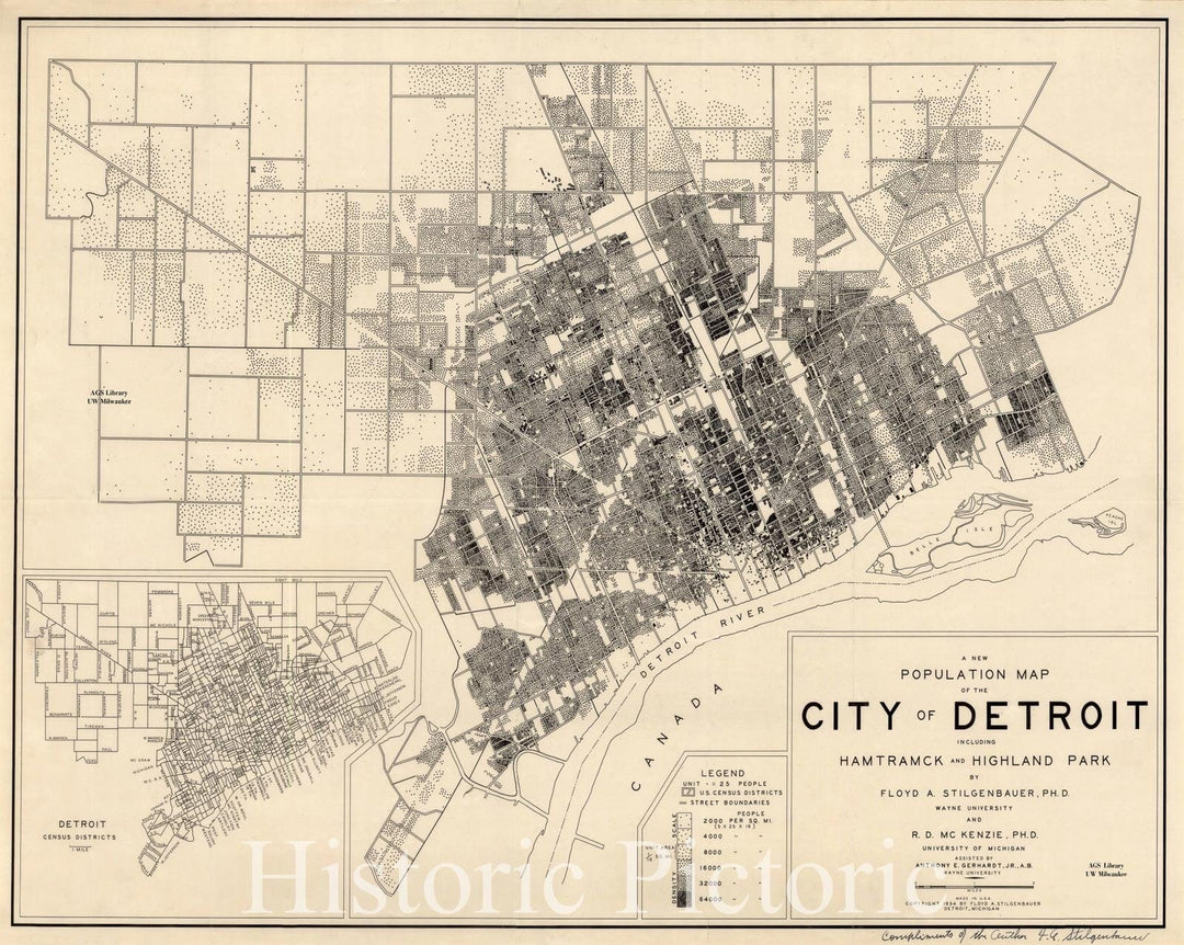 Map : Detroit, Michigan 1934, A New population map of the City of Detroit including Hamtramck and Highland Park , Antique Vintage Reproduction