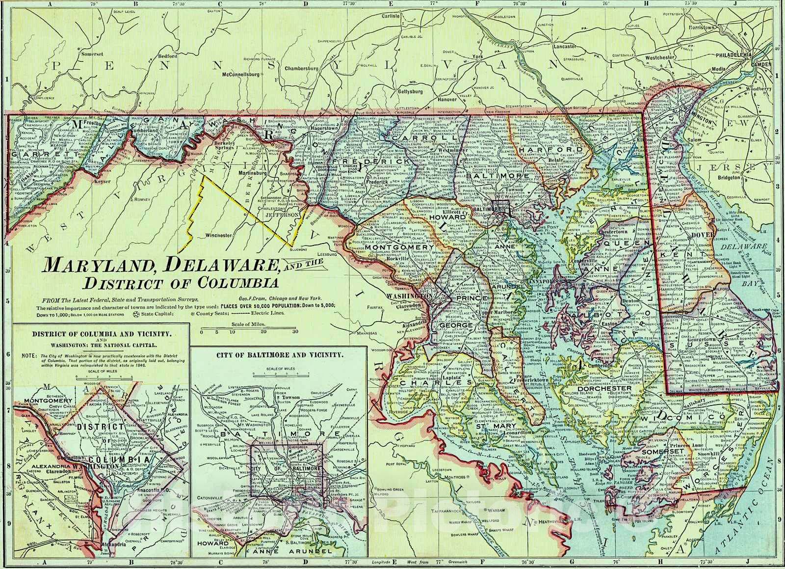 Vintage Map | 1909 Maryland, Delaware and the District of Columbia | Cram, George F.