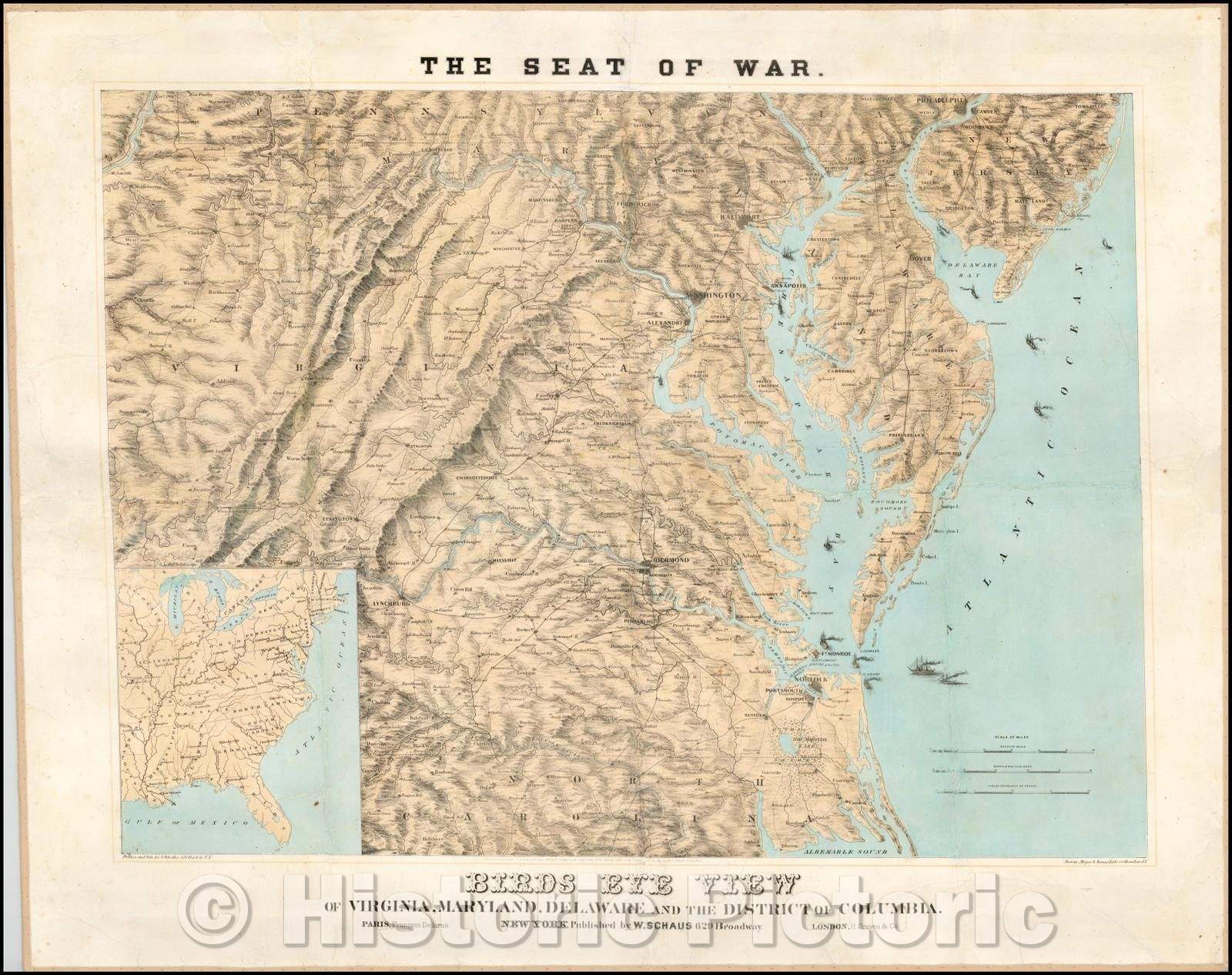 Historic Map - Birds Eye View Of Virginia, Maryland, Delaware And the District of Columbia, 1861, J. Schedler v1