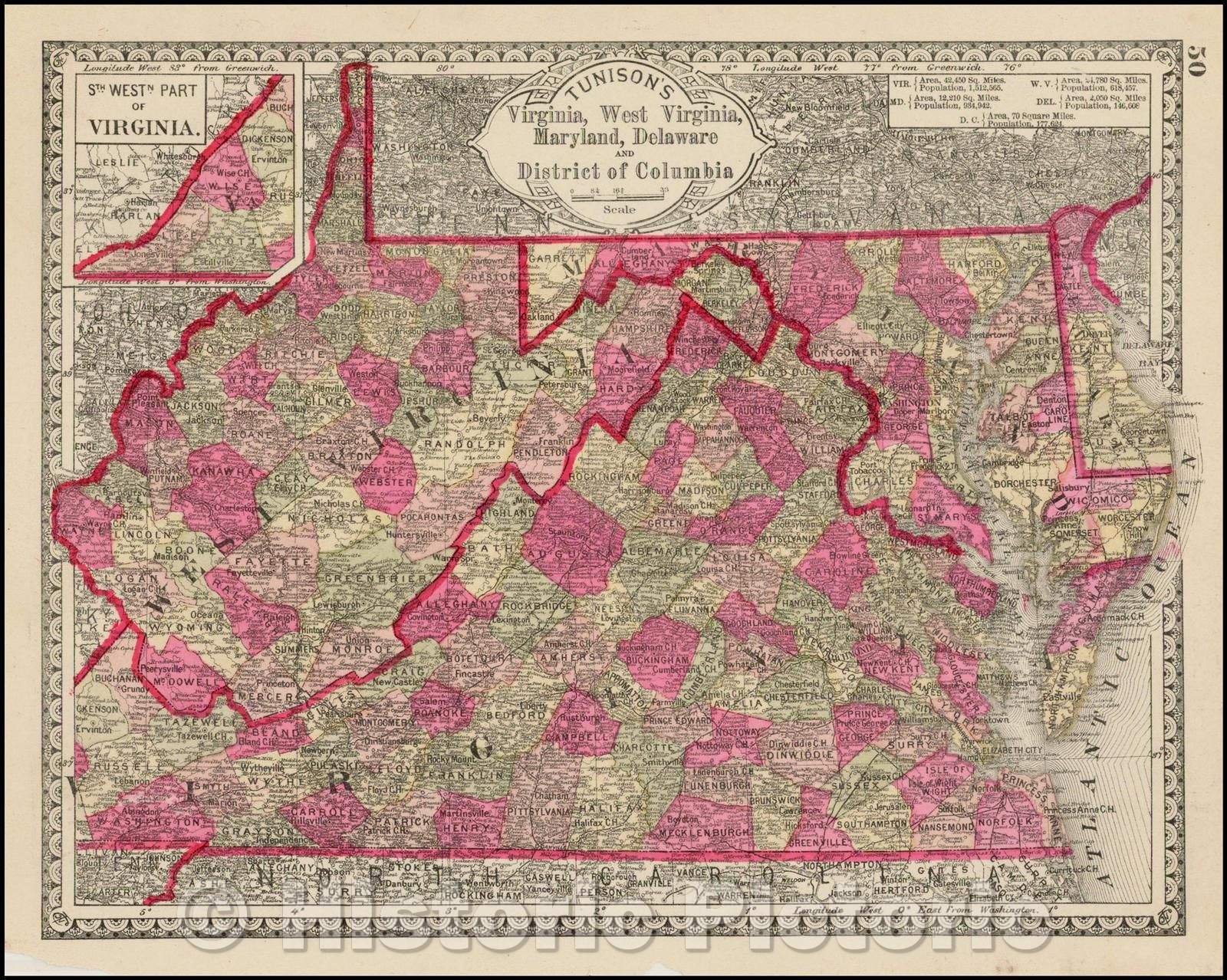 Historic Map - Tunison's Virginia, West Virginia, Maryland, Delaware and District of Columbia, 1883, H.C. Tunison - Vintage Wall Art