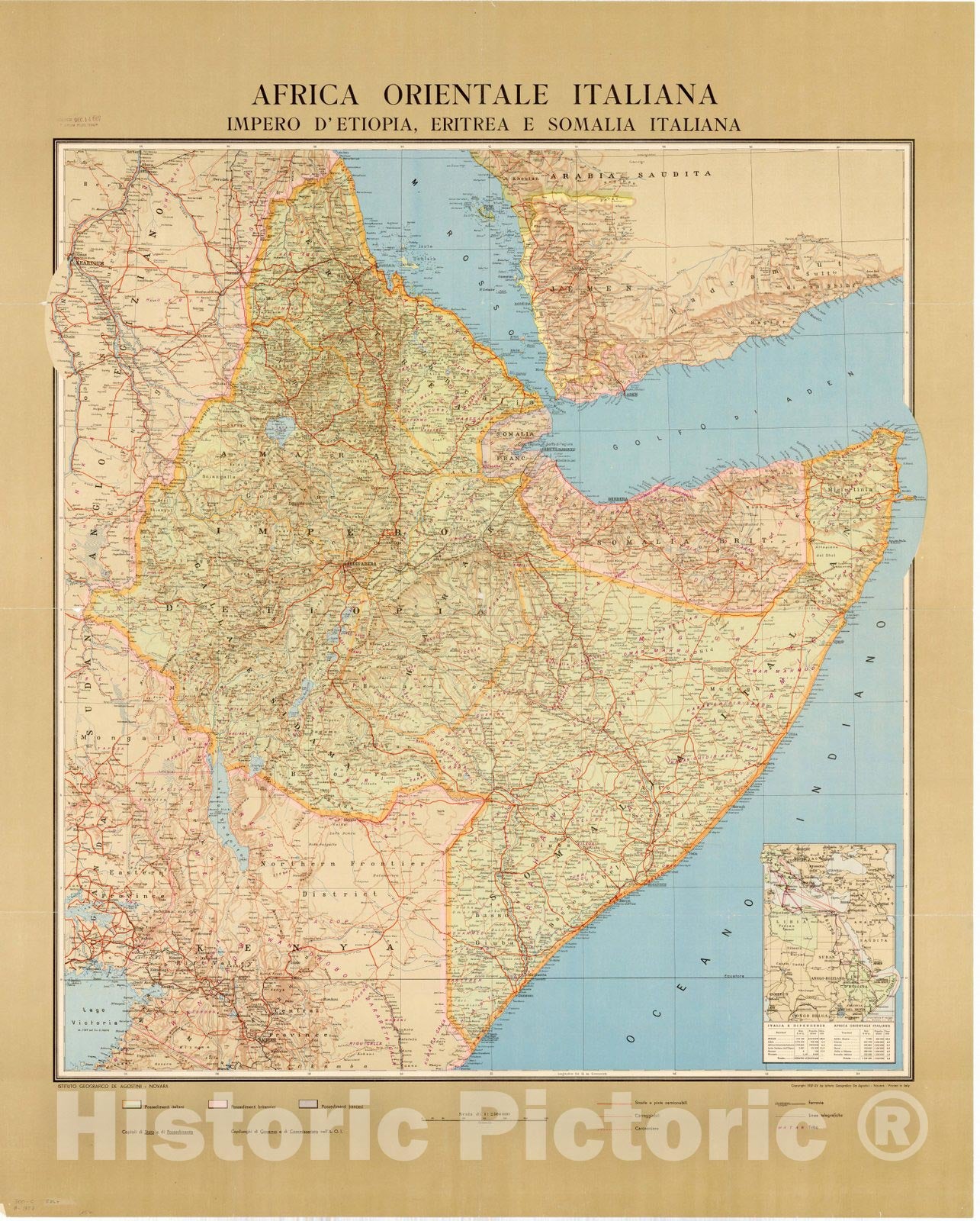 Map : Africa, eastern 1937, Africa orientale Italiana, impero d'Etiopia, Eritrea e Somalia Italiana , Antique Vintage Reproduction