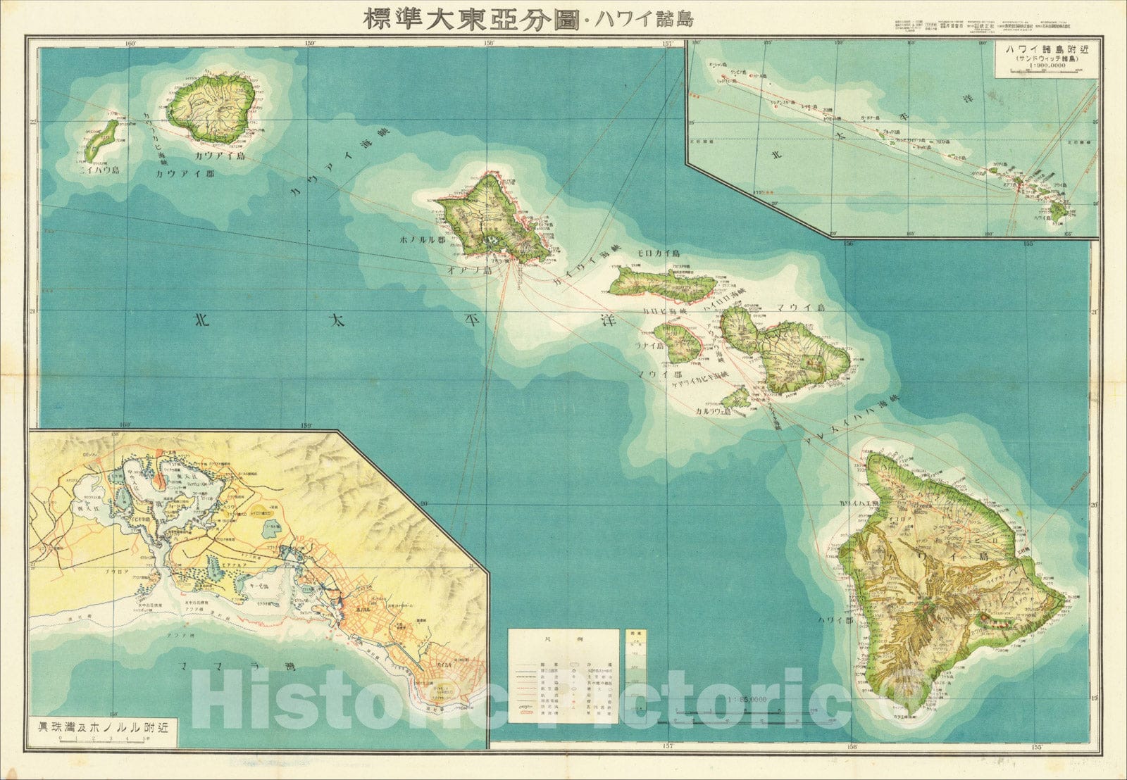 Historic Map : (Hawaii) ??????? : ????? (Standard Map of the Great East Co-Prosperity Sphere. Hawaiian Islands), 1943, Greater East Asian Co-Prosperity Sphere, Vintage Wall Art