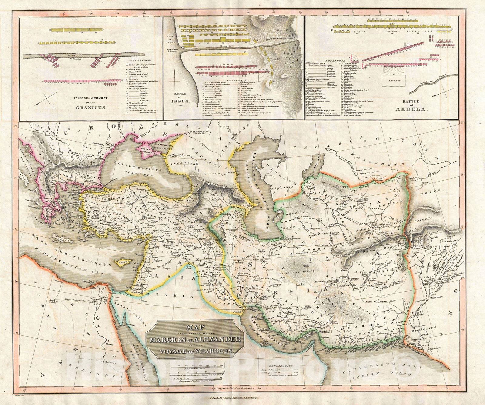 A rare 1829 John Thomson historical map illustrating the Battles and Marches of Alexander the Great. Centered on the Caspian Sea, the map cover from the Adriatic Sea to Indus River Valley and from Crimea to the Red Sea, including all of the modern day Middle East, as well as Persia (Iran), Afghanistan, Turkey, northern Arabia, Israel / Palestine, Syria, Jordan, Greece, the Caucuses, etc. Route markings show both the marches of Alexander the Great into Persia as well as the voyage of Nearchus, a Navarch (Admiral) under Alexander the Great, from the Indus River to the Persian Gulf. Additional routes noted include the March of Hephestion and the March of Craterus. At the top of the map, three additional maps detail strategies employed by Alexander at three historic battles: The Granicus, Issus, and Arbela (Battle of Gaugamela).