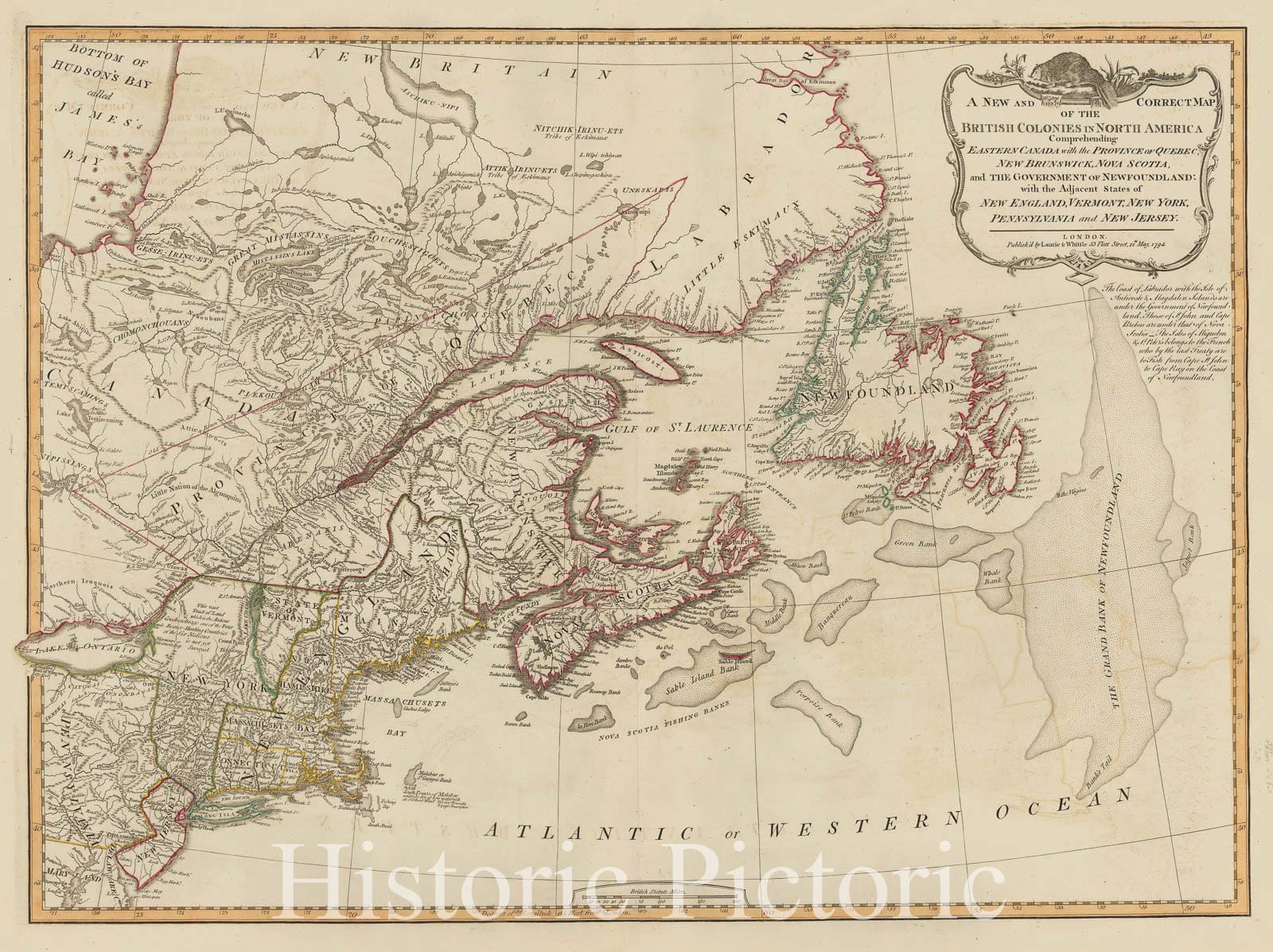 Historic Map - Tthe British Colonies in North America Comprehending Eastern Canada with Adjacent States of New England, Vermont, New York, 1794 - Vintage Wall Art