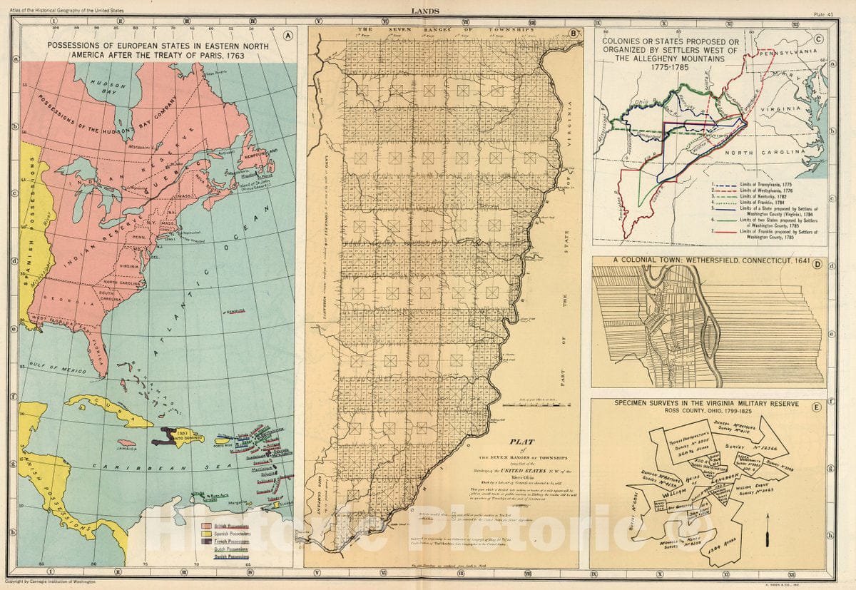 Plate 41. Lands. Possessions of European States in Eastern North America after the Treaty of Paris, 1763. Plat of ... the United States N.W. of the River Ohio (Facsimile). Colonies or States Proposed or Organized by Settlers West of the Allegheny Mountains,1775-1785. A Colonial Town: Wethersfield, Connecticut, 1641 (Facsimile). Specimen Surveys in the Virginia Military Reserve, Ross County, Ohio, 1799-1825 (Facsimile). | Atlas of the Historical Geography of the United States. By Charles O. Paullin, Carnegie Institution of Washington. Edited by John K. Wright, Librarian, American Geographical Society of New York. Published Jointly by Carnegie Institution of Washington and the American Geographical Society of New York, 1932. | Publisher:Carnegie Institution of Washington