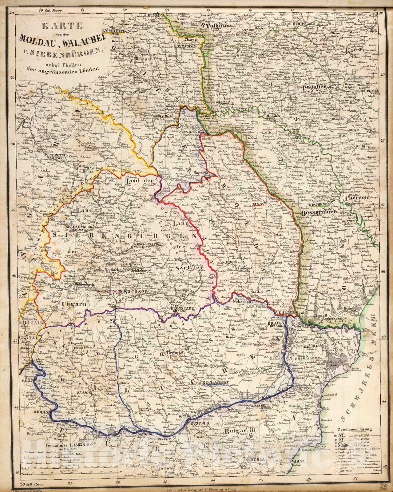 Historic Wall Map : Poland; Romania, Europe, Eastern 1855 Moldau, Walachei, Siebenburgen. , Vintage Wall Art