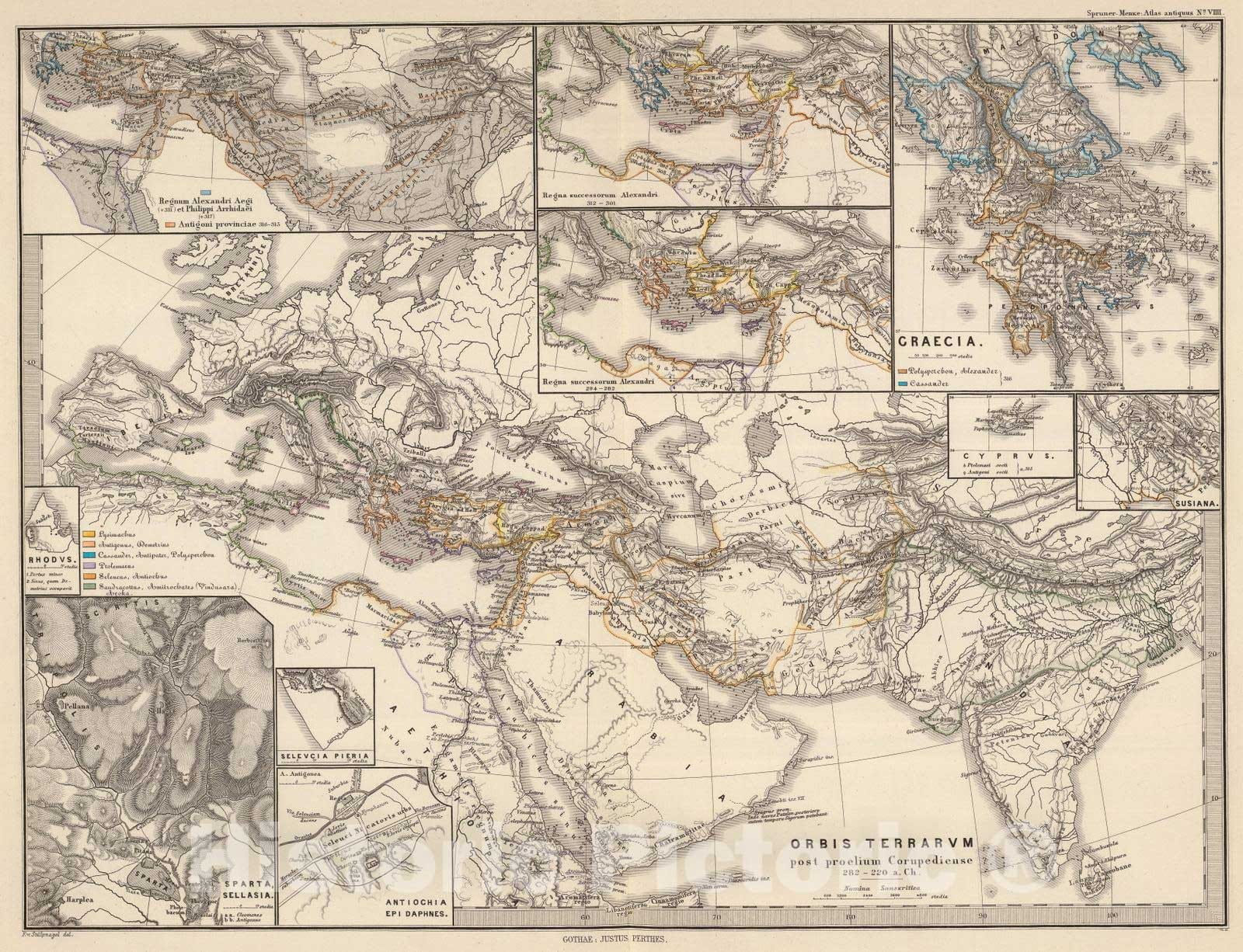 Historic Map : Greece; Syria, Mediterranean Region, Eastern Hemisphere 1865 Orbis terrarum post proelium Corupediense 282-220 a. Ch. , Vintage Wall Art