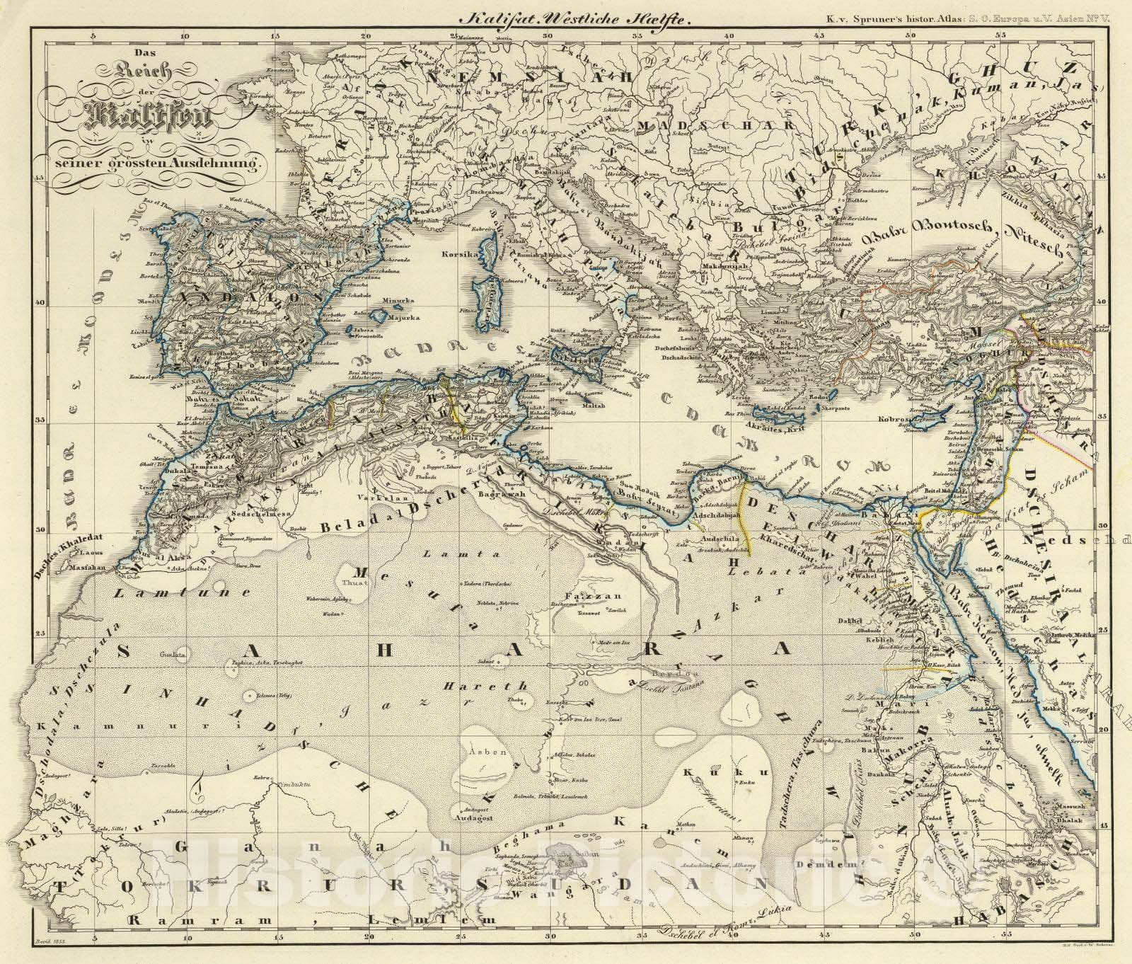 Historic Map : Mediterranean Region, Eastern Hemisphere 1855 Das Reich Kalifen in seiner grossten Ausdehnung - West. , Vintage Wall Art