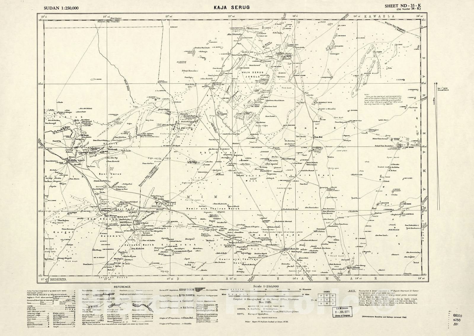 Historic 1909 Map - Sudan 1:250,000 - Kaja Serug Sheet ND-35-K (Old Number 54-K) Nov 1935 - Anglo-Egyptian Sudan
