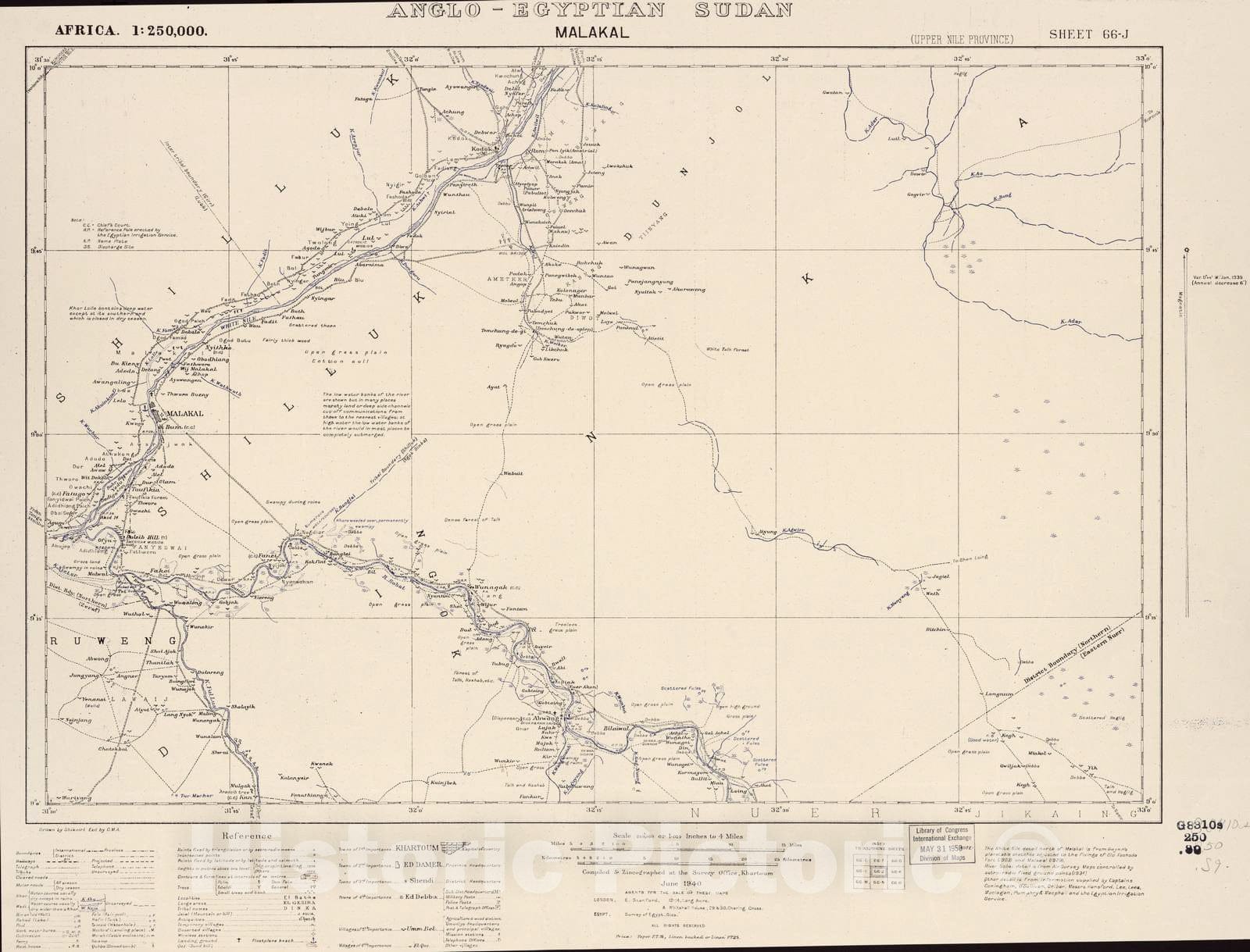 Historic 1909 Map - Sudan 1:250,000 - Malakal Sheet 66-J Jun 1940 - Anglo-Egyptian Sudan