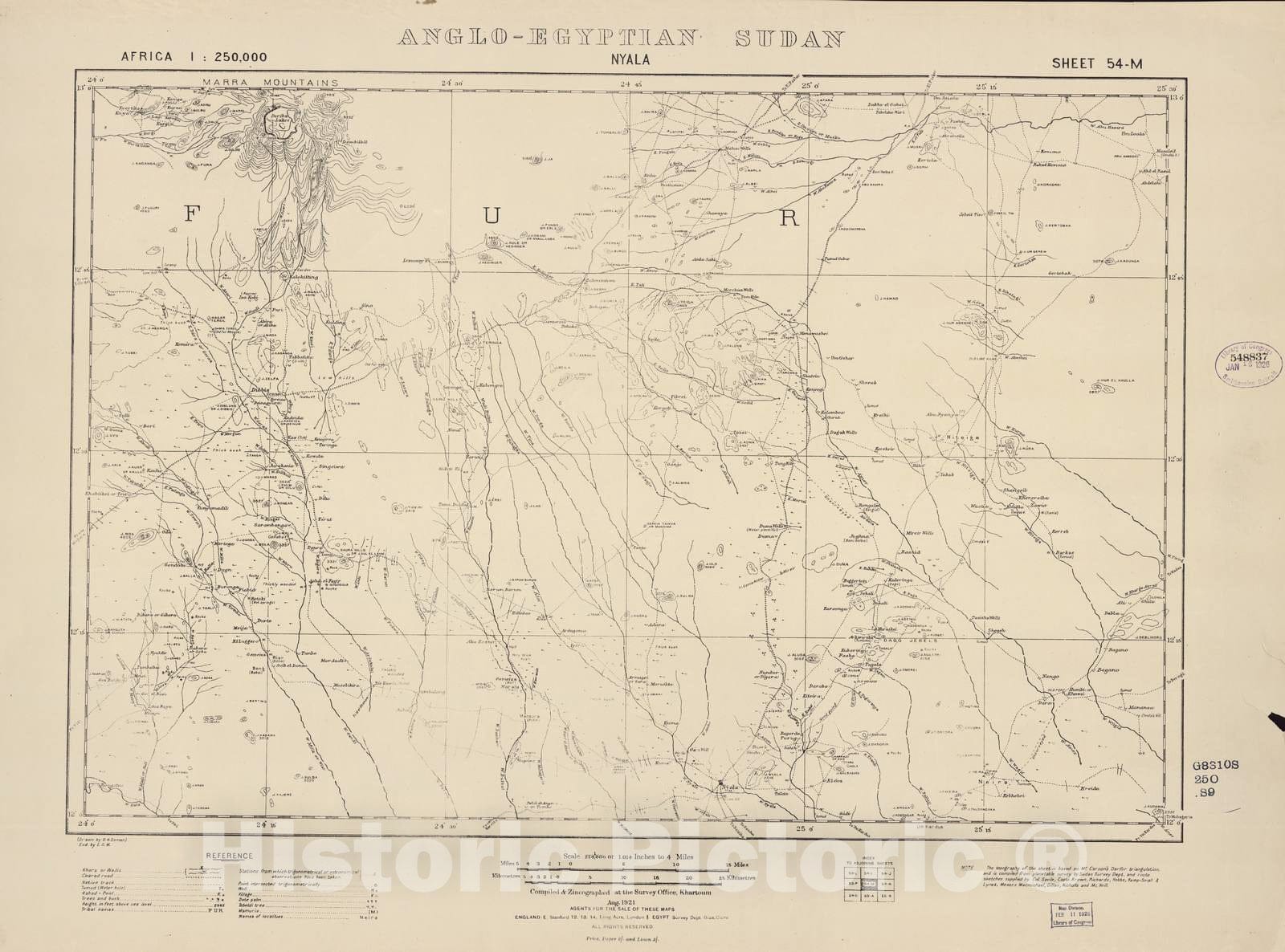 Historic 1909 Map - Sudan 1:250,000 - Nyala Sheet 54-M Aug 1921 - Anglo-Egyptian Sudan