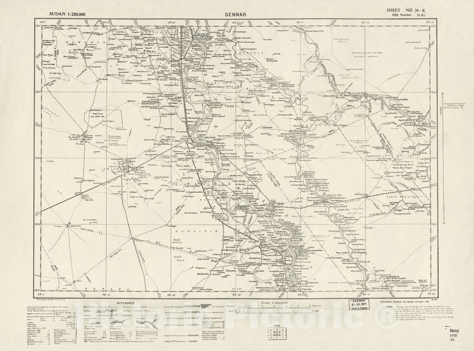 Historic 1909 Map - Sudan 1:250,000 - Sennar Sheet ND-36-K (Old Number 55-K; No Month) 1965 - Anglo-Egyptian Sudan