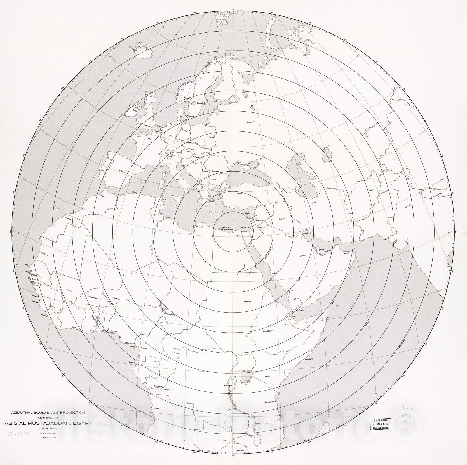 Historic 1975 Map - Azimuthal equidistant Projection Centered on Abs al Mustajaddah, Egypt, 3108N, 3006E.