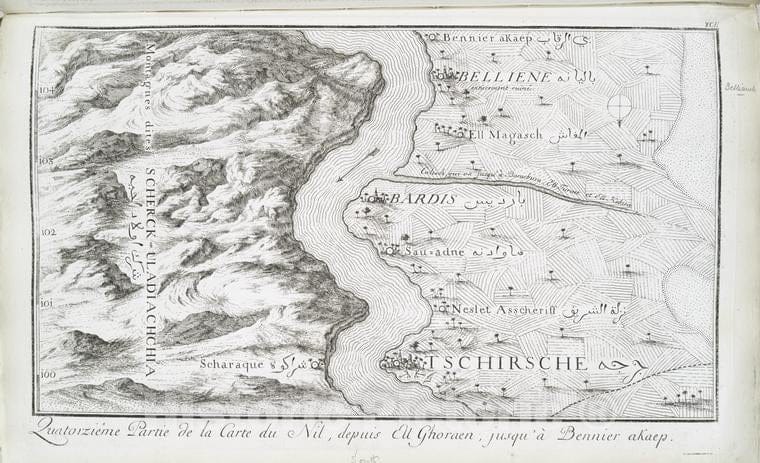 Historic Map - 1780 Egypt, Nubia And Thebes, Nile River, Quatorzieme Artie De La Carte Du Nil, Depuis Ell Ghoraen, Jusqu'A Bennier Akaep. - Vintage Wall Art