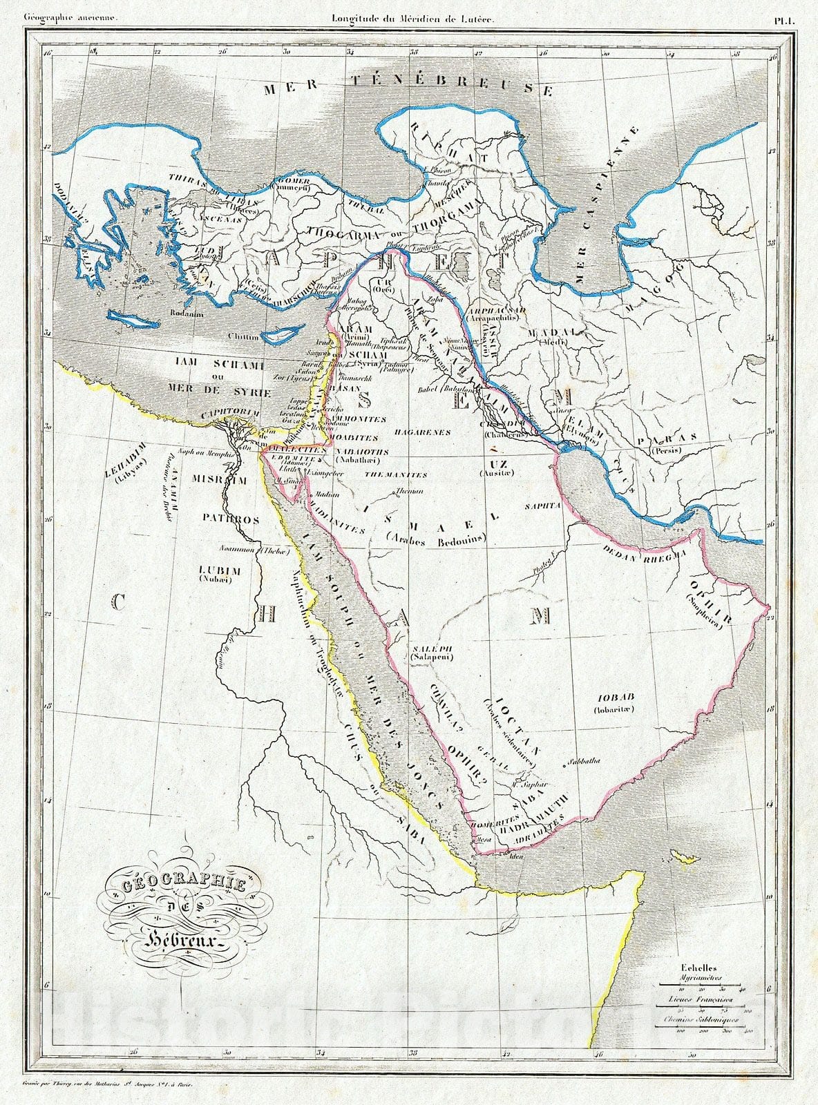 This is Conrad Malte Brun's very appealing map of the Biblical geography of the Torah and Old Testament. Covers what is modern day Egypt, Arabia, Persia and Turkey. Notes many Old Testament lands and Kingdoms including the lands of Magog, Canaan, Saleph, Lubim, Misrim and others. Land extends northward only slightly beyond the 42nd degree of latitude, where it meets the mythical Mar Tenebreuse. Engraved by Thierry as plate no. 1 in Malte Brun's Geographie Ancienne .