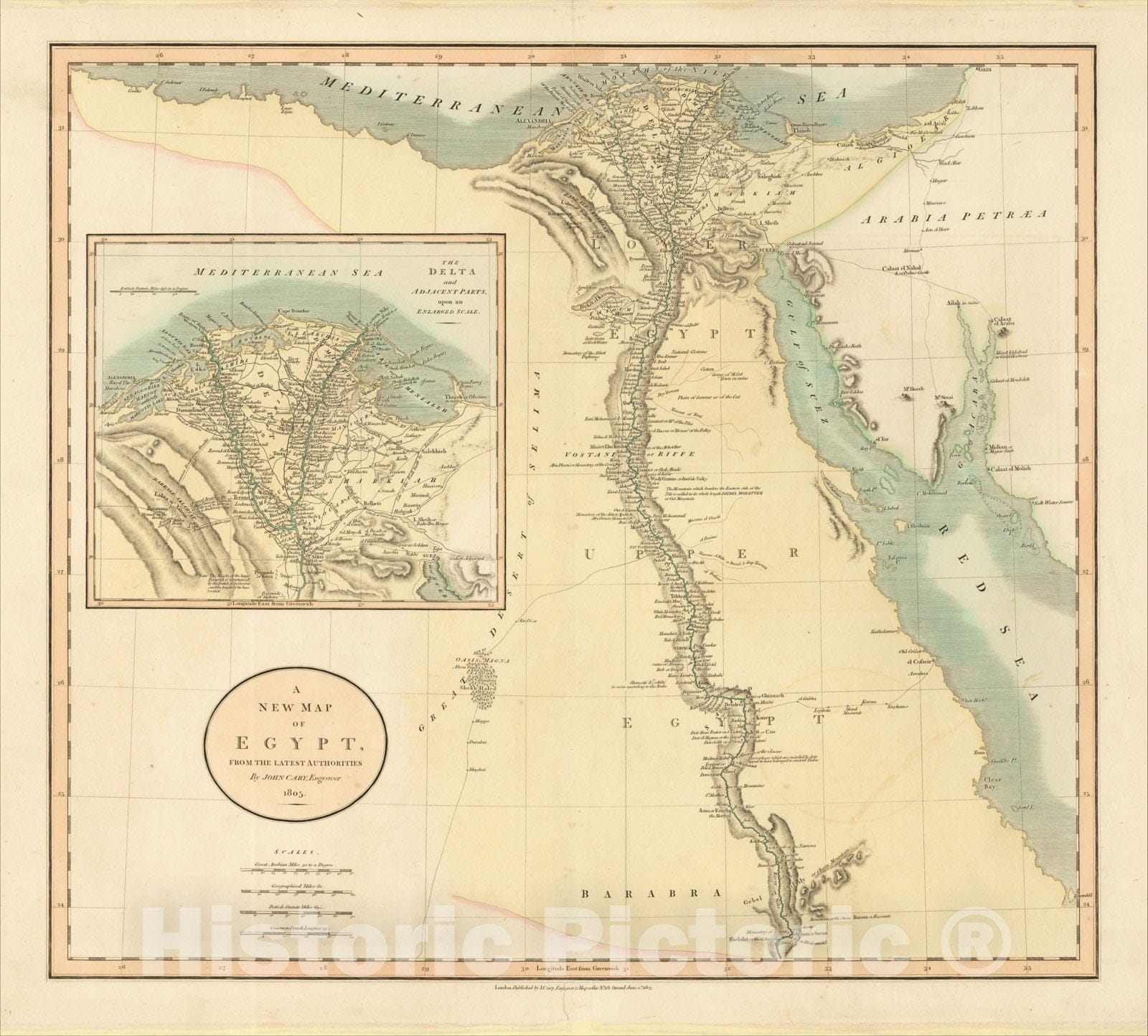 • .Historic Map : A New Map of Egypt, From the Latest Authorities, 185, 1805, John Cary, Vintage Wall Art