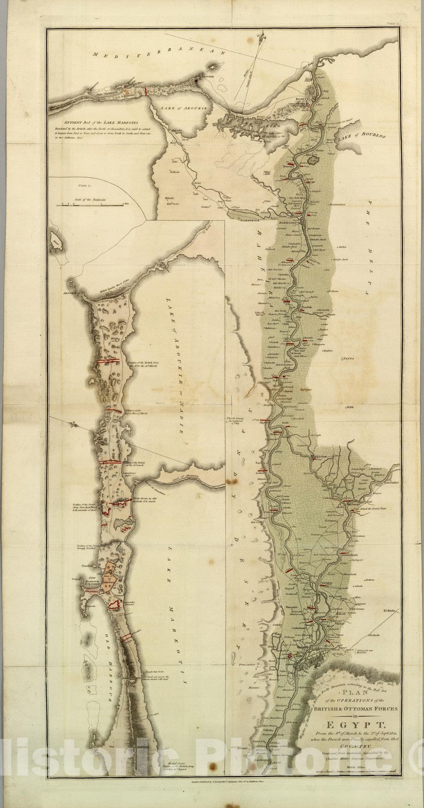 Plan of the Operations of the British & Ottoman Forces in Egypt, From the 8th of March to the 2d. of Septr. 1801, when the French were Finally expelled from that Country. Composed from materials furnished by the Quarter Master Generals Department. London, Published by A. Arrowsmith, 1st. September 1802 No. 24 Rathbone Place. Engraved by S.J. Neele 352 Strand. (inset) Plate 1: (Alexandria peninsula on an enlarged scale.) | Plan of the Operations of the British & Ottoman Forces in Egypt, From the 8th of March to the 2d. of Septr. 1801, when the French were Finally expelled from that Country. Composed from materials furnished by the Quarter Master Generals Department. London, Published by A. Arrowsmith, 1st. September 1802 No. 24 Rathbone Place. Engraved by S.J. Neele 352 Strand. |