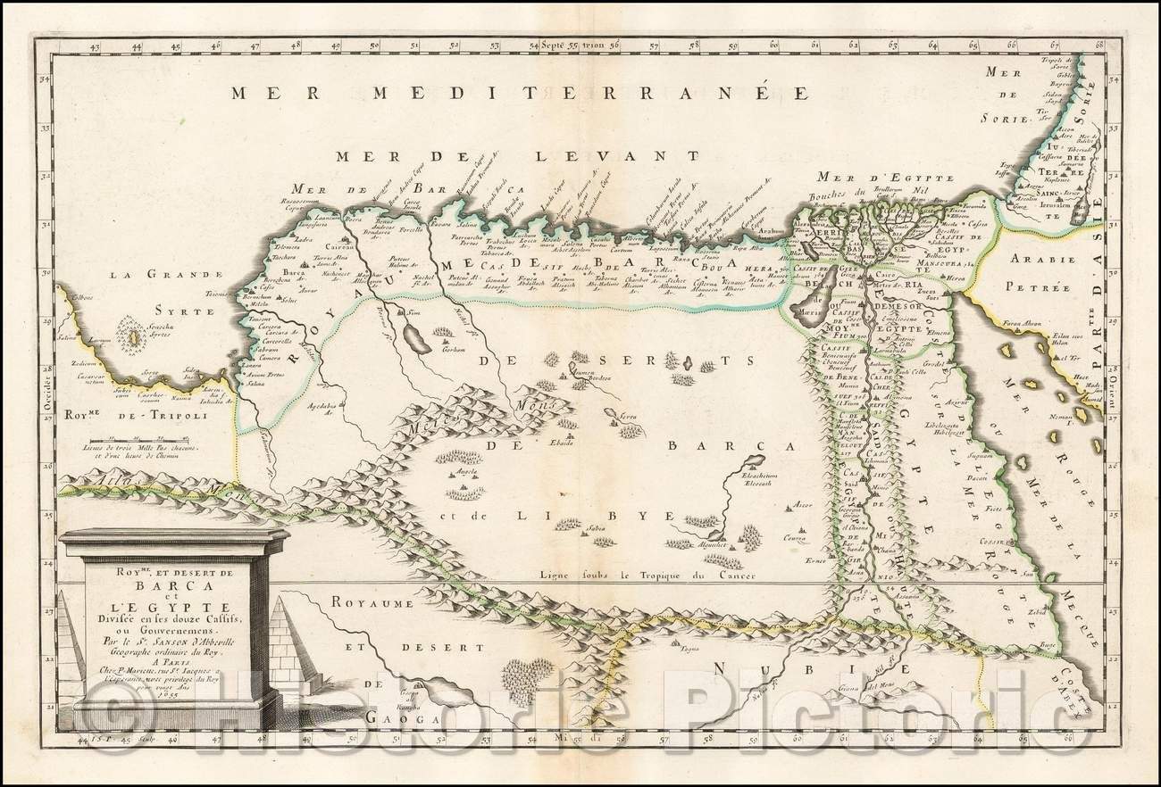 • .Historic Map - Royme. et Desert de Barca et L'Egypte Divisee en ses douze Cassiss/Royme. and Desert Barca and Egypt Divided into twelve Cassiss. 1655, 1655 - Vintage Wall Art