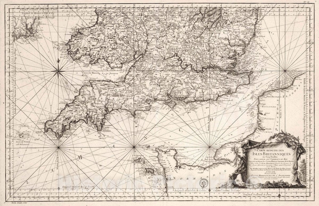 Historic Map : England, English Channel Carte Reduite des Isles Britanniques, 1757 Chart , Vintage Wall Art