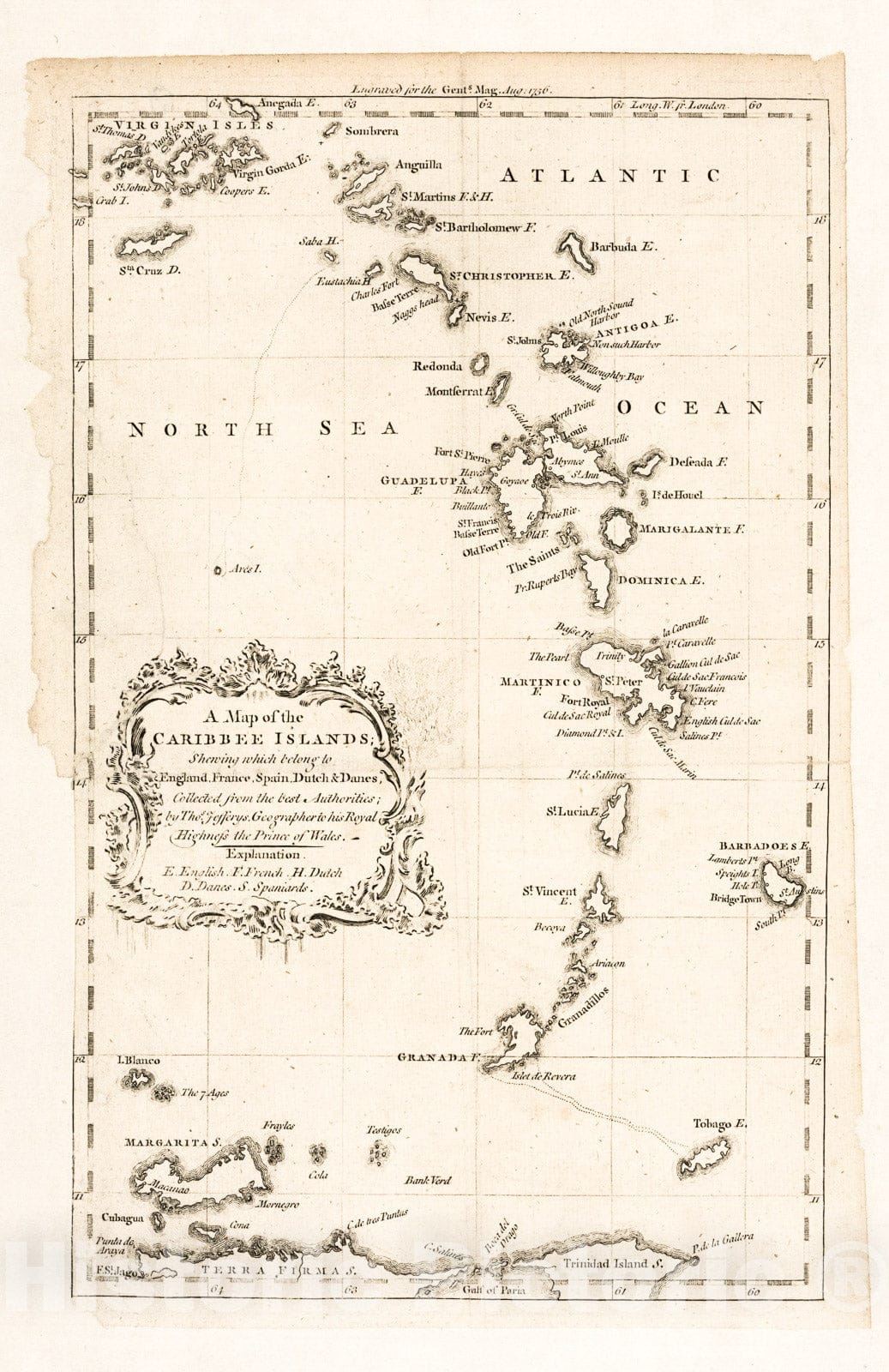• Historic 1756 Map - A map of The Caribbee Islands : shewing which Belong to England, France, Spain, Dutch & Danes Collected from The Best Authorities