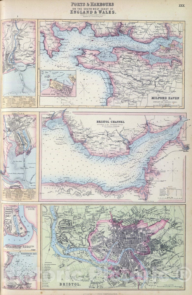 Historic Map : 1872 Ports & Harbours on the South-West Coast of England. - Vintage Wall Art