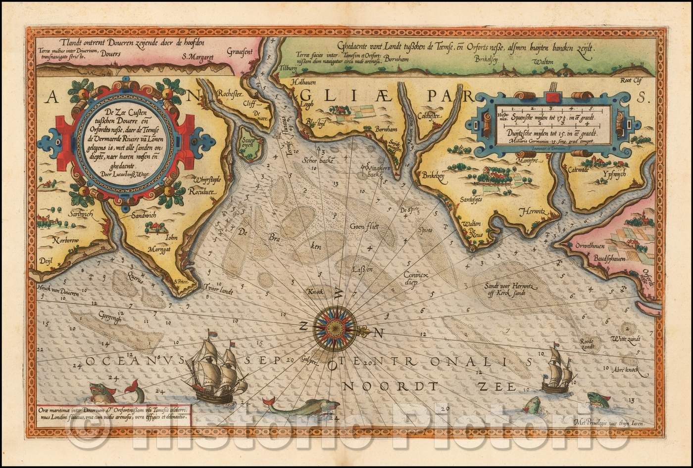 Historic Map - De Zee Custen tusschen Dovere en Orfordts Ness, daer de Teemse/Lucas Waghenaer's Sea Chart, Eastern Coastline of England, 1588 - Vintage Wall Art