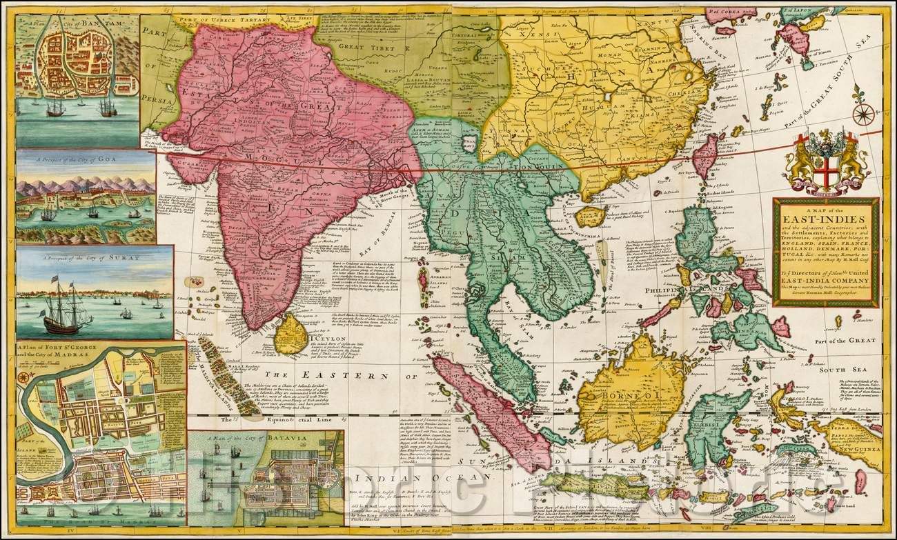 Historic Map - East-Indies and the Adjacent Countries; with the Settlements, Factories and Territories, explaining what Belongs to England, Spain, Franc, 1710 - Vintage Wall Art
